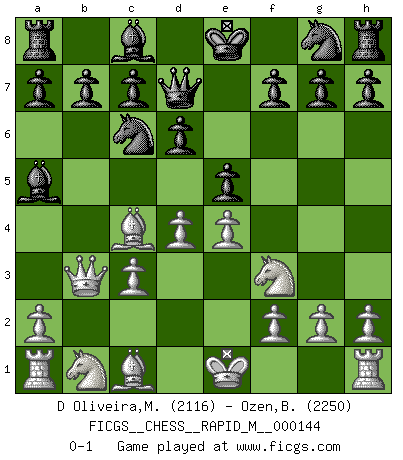 Last move : 0-1 2023 May 2 19:49:8 [Event "FICGS__CHESS__RAPID_M__000144"] [Site "FICGS"] [Date "2023.03.24"] [Round "1"] [White "D Oliveira,Marcos Arruda"] [Black "Ozen,Bahadir"] [Result "0-1"] [WhiteElo "2116"] [BlackElo "2250"] 1.e4 e5 2.Nf3 Nc6 3.Bc4 Bc5 4.b4 Bxb4 5.c3 Ba5 6.d4 d6 7.Qb3 Qd7 0-1 This chess game has been lost on time (started : 2023.03.24 12:44:5) Follow this game move after move (download)When I asked Fischer why he had not played a certain move in our game, he replied: 'Well, you laughed when I wrote it down !' (Mikhail Tal) Wer sich die Fähigkeit anerziehen will im Schach selbstständig zu denken, der muß alles meiden, was leblos ist: ausgeklügelte Theorien, die sich auf sehr wenige Beispiele und eine Menge Hirngespinste stützen. (Emanuel Lasker) Los asuntos humanos son como una partida de Ajedrez: solo aquellos que no lo toman seriamente, pueden ser llamados buenos jugadores. (Hung Tzu Ch'eng) J'ai vu le vaincu d'Echecs jouer des années durant dans l'espoir de la fête de la victoire. Car tu es plus riche de ce qu'elle existe si même elle n'est point pour toi. Ainsi de la perle du fond des mers. (Antoine de Saint-Exupéry) Establishing goals is all right if you don't let them deprive you of interesting detours. (Doug Larson)