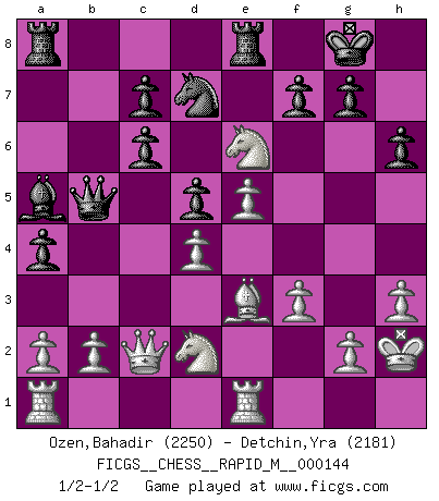 Last move : 1/2-1/2 2023 April 2 10:42:8 [Event "FICGS__CHESS__RAPID_M__000144"] [Site "FICGS"] [Date "2023.03.24"] [Round "1"] [White "Ozen,Bahadir"] [Black "Detchin,Yra"] [Result "1/2-1/2"] [WhiteElo "2250"] [BlackElo "2181"] 1.e4 e5 2.Nf3 Nc6 3.Bc4 Bc5 4.c3 Nf6 5.d3 d6 6.O-O O-O 7.h3 a5 8.Re1 h6 9.Nbd2 Be6 10.Bb5 Qb8 11.Nf1 Qa7 12.Qd2 a4 13.Ng3 Rfd8 14.Bxc6 bxc6 15.d4 Bb6 16.Qd1 Qa5 17.Be3 Qb5 18.Qc2 Rdb8 19.Kh2 Re8 20.Nd2 exd4 21.cxd4 Qb4 22.Ne2 Qb5 23.f3 Ba5 24.Nf4 d5 25.e5 Nd7 26.Nxe6 1/2-1/2 Follow this game move after move (download)Live, lose, and learn, by observing your opponent how to win. (Amber Steenbock) Die meiste Zeit treffe ich auf Gegner, die meine Enkel sein könnten. Ich bin da, um ihnen zu zeigen, dass sie von mir noch einiges lernen können. (Viktor Kortschnoi) Vive, pierde y aprende al observar a tu oponente como ganar. (Amber Steenbock) On a dit que l'homme se distingue de l'animal par le fait qu'il achète plus de livres qu'il ne peut en lire. Je voudrais suggérer qu'inclure à la liste des livres quelques livres d'échecs rendrait la distinction manifeste. (Edward Lasker) Coffee just isn't my cup of tea. (Unknown)
