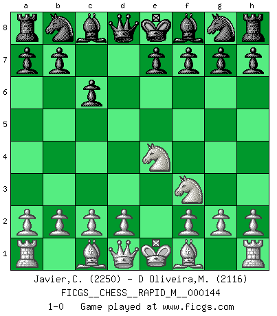 Last move : 1-0 2023 May 2 7:49:37 [Event "FICGS__CHESS__RAPID_M__000144"] [Site "FICGS"] [Date "2023.03.24"] [Round "1"] [White "Javier,Christian"] [Black "D Oliveira,Marcos Arruda"] [Result "1-0"] [WhiteElo "2250"] [BlackElo "2116"] 1.e4 c6 2.Nf3 d5 3.Nc3 dxe4 4.Nxe4 1-0 This chess game has been lost on time (started : 2023.03.24 12:44:5) Follow this game move after move (download)My style is somewhere between that of Tal and Petrosian. (Reshevsky) Alle Schachspieler sollten auch ein Hobby haben. (Savielly Grigorievitsch Tartakower) El Ajedrez no es una pizca de inferior al violín, y tenemos un gran número de violinistas profesionales. (Mikhail Botvinnik) Si je n'étais pas joueur d'échecs, je serais le meilleur dans quelque chose d'autre. (Anatoli Karpov) I find your interest interesting. (Gregory House, House M.D.)