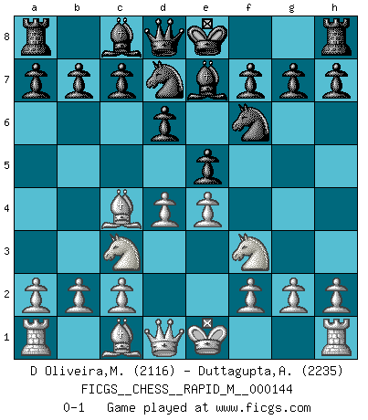 Last move : 0-1 2023 May 13 20:30:41 [Event "FICGS__CHESS__RAPID_M__000144"] [Site "FICGS"] [Date "2023.03.24"] [Round "1"] [White "D Oliveira,Marcos Arruda"] [Black "Duttagupta,Aniruddha"] [Result "0-1"] [WhiteElo "2116"] [BlackElo "2235"] 1.e4 d6 2.d4 Nf6 3.Nc3 e5 4.Nf3 Nbd7 5.Bc4 Be7 0-1 This chess game has been lost on time (started : 2023.03.24 12:44:5) Follow this game move after move (download)All Chess players should have a hobby. (Savielly Tartakower) Wenn Du einsam bist, wenn Du Dich in der Welt wie ein Fremder fühlst, spiele Schach. Das wird Deinen Geist erheben und Dein Ratgeber im Kampf sein. (Aristoteles) Todo lo que importa ante el tablero de Ajedrez son buenas jugadas. (Bobby Fischer) Votre seul travail dans les ouvertures est d'obtenir un milieu de partie jouable. (Lajos Portish) Quotation,n.: The act of repeating erroneously the words of another. The words erroneously repeated. (Ambrose Bierce, The Devil's Dictionary)