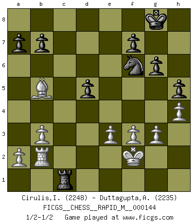 Last move : 1/2-1/2 2023 June 9 20:53:50 [Event "FICGS__CHESS__RAPID_M__000144"] [Site "FICGS"] [Date "2023.03.24"] [Round "1"] [White "Cirulis,Ilmars"] [Black "Duttagupta,Aniruddha"] [Result "1/2-1/2"] [WhiteElo "2248"] [BlackElo "2235"] 1.e3 d5 2.c4 e6 3.Nc3 Nf6 4.Nf3 Bd6 5.b3 O-O 6.Bb2 c5 7.cxd5 exd5 8.d4 cxd4 9.Nxd4 Nc6 10.Be2 Re8 11.O-O Nxd4 12.Qxd4 Be5 13.Qd2 Be6 14.Rfd1 Rc8 15.Rac1 Qa5 16.Bf1 Bg4 17.f3 Bd7 18.g3 Bc6 19.Kf2 h5 20.Nb5 Qxd2+ 21.Rxd2 Bxb2 22.Rxb2 Bxb5 23.Rxc8 Rxc8 24.Bxb5 Rc1 25.h4 g6 1/2-1/2 Follow this game move after move (download)It was clear to me that the vulnerable point of the American Grandmaster (Bobby Fischer) was in double-edged, hanging, irrational positions, where he often failed to find a win even in a won position. (Efim Geller) Sehr viele beherrschen heutzutage das große Einmalseins des Schachspiels und kennen sogar dessen Logarithmentafeln auswendig - deshalb sollte man hin und wieder zu beweisen trachten, dass zwei mal zwei auch fünf sein kann. (Mikhail Nekhemyevich Tal) El sobresalir en el Ajedrez es un signo de una mente intrigante. (Sir Arthur Conan Doyle) D'abord les bases : Jouez et étudiez, puis étudiez et jouez, ensuite jouez et étudiez, puis étudiez et jouez. Deuxièmement : Donnez toujours le meilleur de vous-même ! (Ken Smith) Hello Thibault, if I have had a plan (and I had one, I hope), I have forgotten it during the last week... - Hello Heinz-Georg. What do you mean a plan ? (Anonymous players, during a Big Chess game)