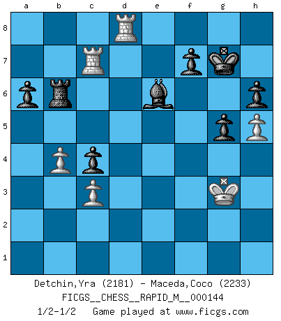Last move : 1/2-1/2 2023 May 1 0:25:40 [Event "FICGS__CHESS__RAPID_M__000144"] [Site "FICGS"] [Date "2023.03.24"] [Round "1"] [White "Detchin,Yra"] [Black "Maceda,Coco"] [Result "1/2-1/2"] [WhiteElo "2181"] [BlackElo "2233"] 1.e4 c5 2.c3 Nf6 3.e5 Nd5 4.Nf3 Nc6 5.Bc4 Nb6 6.Bb3 c4 7.Bc2 Qc7 8.O-O Nxe5 9.Nxe5 Qxe5 10.Re1 Qc7 11.a4 e6 12.d3 cxd3 13.Qxd3 Be7 14.Na3 a6 15.a5 Nd5 16.Bb3 Nf6 17.Nc4 Bc5 18.Be3 O-O 19.Bc2 d5 20.Nb6 Rb8 21.Ra4 g6 22.Bf4 Bd6 23.Qe3 Bxf4 24.Rxf4 Nd7 25.h4 Qd8 26.Qg3 Nxb6 27.h5 g5 28.Rg4 h6 29.Qxb8 Nc4 30.b4 Qd6 31.Qxd6 Nxd6 32.f4 e5 33.Rg3 exf4 34.Rd3 Be6 35.Bb3 Nc4 36.Bxc4 dxc4 37.Rd4 Kg7 38.g3 fxg3 39.Kg2 Rb8 40.Kxg3 b6 41.Ra1 bxa5 42.Rxa5 Rb6 43.Rd8 Rc6 44.Rc5 Rb6 45.Rc7 1/2-1/2 Follow this game move after move (download)The Chess pieces are the block alphabet which shapes thoughts; and these thoughts, although making a visual design on the chessboard, express their beauty abstractly, like a poem. (Marcel Duchamp) Privat ist Kortschnoi kein schlechter Mensch, sehr sympathisch. Aber während des Spiels ist er grausam. Er will dich töten. (Miguel Najdorf) ¡Examina movidas que hagan daño! Un buen ojo for movidas desvastantes es mucho mas importante que el conocimiento de principios estratégicos. (Purdy) Les échecs, c'est la lutte contre l'erreur. (Johannes Zukertort) Life is verb, not a noun. (Charlotte Perkins Gilman)