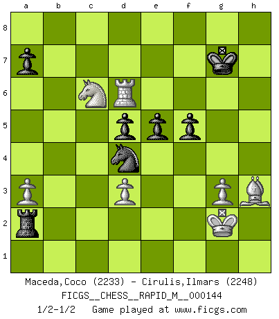 Last move : 1/2-1/2 2023 April 30 21:1:18 [Event "FICGS__CHESS__RAPID_M__000144"] [Site "FICGS"] [Date "2023.03.24"] [Round "1"] [White "Maceda,Coco"] [Black "Cirulis,Ilmars"] [Result "1/2-1/2"] [WhiteElo "2233"] [BlackElo "2248"] 1.c4 c5 2.Nc3 g6 3.Nf3 Bg7 4.g3 Nc6 5.Bg2 e6 6.d4 Nxd4 7.Nxd4 cxd4 8.Ne4 d5 9.Qa4+ Kf8 10.Qa3+ Qe7 11.Nd6 Be5 12.c5 h5 13.O-O h4 14.Bg5 Qxg5 15.f4 Bxf4 16.Rxf4 f5 17.c6 Qe7 18.cxb7 Bxb7 19.Nxb7 Qxa3 20.bxa3 h3 21.Bf1 e5 22.Rf3 Rc8 23.Rb1 Ke7 24.Na5 Nf6 25.Rb7+ Kd6 26.Rfb3 Rh7 27.Rxh7 Nxh7 28.Rb7 d3 29.exd3 Ng5 30.Rg7 Nf3+ 31.Kf2 Nd4 32.Rxg6+ Ke7 33.Bxh3 Rc2+ 34.Ke1 Kf7 35.Rh6 Rxh2 36.Kf1 Rh1+ 37.Kg2 Ra1 38.Nc6 Rxa2+ 39.Kf1 Kg7 40.Rd6 Ra1+ 41.Kg2 Ra2+ 42.Kf1 Ra1+ 43.Kg2 Ra2+ 1/2-1/2 Follow this game move after move (download)Chess is thirty to forty percent psychology. You don't have this when you play a computer. I can't confuse it. (Judith Polgar) Ich verstehe Aljechins Kombinationen ganz gut; aber woher er diese Angriffschancen bekommt und wie er die Eröffnung behandelt das ist für mich ein Buch mit sieben Siegeln. (Rudolf Spielmann) No hay otro maestro que tenga una voluntad terrífica de ganar. Al tablero, el irradía peligro y aún los oponentes mas fuertes tienden a congelarse como liebres cuando olfatean a una pantera. Aún sus debilidades son peligrosas. Con las blancas, su juego de apertura es predecible - te es posible hacer planes en su contra - pero es tan fuerte que tus planes casi nunca funcionan. En el juego medio, su precisión e invención son fabulosas y en finales, tú simplemente no le puedes vencer. (Experto Alemán anónimo) Les échecs sont un jeu par leur forme, un art par leur essence et une science par sa difficulté d'acquisition. Ils peuvent vous procurer autant de plaisir qu'un bon livre ou une belle musique, mais vous n'aurez une réelle joie que si vous arrivez à bien jouer. (Tigran Petrosian) Wisdom is the reward you get for a lifetime of listening when you'd have preferred to talk. (Doug Larson)