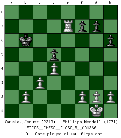 Last move : 1-0 2023 May 3 10:4:41 [Event "FICGS__CHESS__CLASS_B__000366"] [Site "FICGS"] [Date "2023.03.25"] [Round "1"] [White "Swiatek,Janusz"] [Black "Phillips,Wendell"] [Result "1-0"] [WhiteElo "2213"] [BlackElo "1771"] 1.e4 d6 2.d4 c6 3.Nf3 Qc7 4.Bc4 h6 5.Bf4 Nd7 6.e5 dxe5 7.Nxe5 Nxe5 8.Bxe5 Qa5+ 9.c3 Nf6 10.a4 Bd7 11.Qb3 e6 12.Qxb7 Rc8 13.Nd2 Qb6 14.Ba6 Qxb7 15.Bxb7 Rd8 16.Bc7 Be7 17.Nc4 Nd5 18.Bxd8 Kxd8 19.Ne5 Rf8 20.Bxc6 Bxc6 21.Nxc6+ Kc7 22.Nxa7 Rb8 23.Nb5+ Kb6 24.O-O Ka5 25.Rfe1 Rb7 26.Re5 Rxb5 27.axb5 Kxb5 28.Ra7 Kb6 29.Rxd5 exd5 30.Rxe7 1-0 Follow this game move after move (download)Tactics flow from a superior position. (Bobby Fischer) Immer nach dem besten Zug zu suchen ist ziemlich unpraktisch. (Nigel Short) Un buen sacrificio es aquel que aunque no sea necesariamente sólido, deja a tu oponente aturdido y confuso. (Rudolph Spielmann) Si rien de grave n'est détecté lors de l'analyse d'une position, on joue alors le coup. Seconde règle de Blumenfeld. We cannot be sure of having something to live for unless we are willing to die for it. (Ernesto Che Guevara)