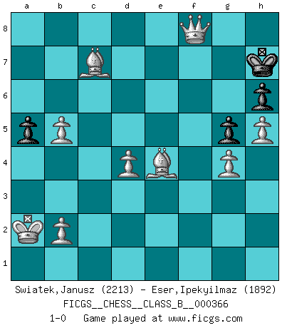 Last move : 1-0 2024 May 14 10:41:1 [Event "FICGS__CHESS__CLASS_B__000366"] [Site "FICGS"] [Date "2023.03.25"] [Round "1"] [White "Swiatek,Janusz"] [Black "Eser,Ipekyilmaz"] [Result "1-0"] [WhiteElo "2213"] [BlackElo "1892"] 1.e4 c6 2.Nf3 d6 3.d4 Bg4 4.h3 Bxf3 5.Qxf3 Nd7 6.Be3 g6 7.Nd2 Bg7 8.O-O-O Kf8 9.g4 Ngf6 10.Be2 h6 11.Kb1 Ne8 12.h4 Nc7 13.Qg3 a6 14.f4 Kg8 15.c3 d5 16.e5 f6 17.Bd3 Nf8 18.f5 g5 19.Rh3 Nb5 20.Rdh1 a5 21.a4 Nd6 22.Qh2 Nf7 23.e6 Nh7 24.exf7+ Kxf7 25.Nb3 b6 26.Re1 Ra7 27.Bc1 Qb8 28.Qf2 Rd8 29.R3h1 Kg8 30.Bc2 Nf8 31.Rh3 Re8 32.Rhe3 Qd6 33.Qe2 Rd8 34.Rh3 Rb8 35.Re3 Kf7 36.c4 Qc7 37.Bd3 Qd6 38.cxd5 cxd5 39.h5 R8b7 40.Na1 Qb8 41.Nc2 Kg8 42.Na3 Rd7 43.Bc2 Kh8 44.Nb5 Rab7 45.Rc3 Rd8 46.Bb3 Rbd7 47.Qc2 Nh7 48.Re6 Nf8 49.Rec6 Kh7 50.Ka1 Kh8 51.Ka2 Kg8 52.Rc8 Rxc8 53.Rxc8 Qb7 54.Be3 Kh7 55.Bg1 Kh8 56.Bh2 Kh7 57.Rb8 Qxb8 58.Bxb8 Rd8 59.Bc7 Rd7 60.Bxb6 Rb7 61.Bc7 Rxb5 62.axb5 Kh8 63.Bxd5 Kh7 64.Qe4 e6 65.fxe6 f5 66.Qxf5+ Kg8 67.e7 Kh8 68.exf8Q+ Bxf8 69.Qxf8+ Kh7 70.Be4+ 1-0 Follow this game move after move (download)Chess teaches you to control the initial excitement you feel when you see something that looks good and it trains you to think objectively when you're in trouble. (Stanley Kubrick) Als er Schachweltmeister wurde ließ er praktisch alle stärksten Sovietspieler für sich arbeiten. Wenn ein auch nur mittelmässiger Meister ein Spezialist für eine bestimmte Eröffnung war, wurde er von Karpov gerufen. Das wurde alles geheim gehalten. (Mikhail Moiseyevich Botvinik) El Ajedrez no es una pizca de inferior al violín, y tenemos un gran número de violinistas profesionales. (Mikhail Botvinnik) Aucun coup ne doit être joué sans but. (Pedro Damiano) There are two major products that came out of Berkeley: LSD and UNIX. We do not believe this is to be a coincidence. (Jeremy S. Anderson)