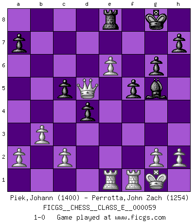Last move : 1-0 2007 November 3 14:57:25 [Event "FICGS__CHESS__CLASS_E__000059"] [Site "FICGS"] [Date "2007.08.25"] [Round "1"] [White "Piek,Johann"] [Black "Perrotta,John Zach"] [Result "1-0"] [WhiteElo "1400"] [BlackElo "1254"] 1.e4 c5 2.f4 Nf6 3.Nc3 d5 4.Nxd5 Nxe4 5.Bb5+ Bd7 6.Bxd7+ Qxd7 7.Ne3 Nc6 8.d3 Nf6 9.Nf3 e6 10.Nc4 Be7 11.O-O O-O 12.Nfe5 Nxe5 13.fxe5 Nd5 14.Qg4 b5 15.Bh6 g6 16.Bxf8 Rxf8 17.Rfd1 bxc4 18.dxc4 Qb7 19.cxd5 exd5 20.b3 d4 21.Rf1 Qd5 22.Rae1 Re8 23.e6 f5 24.Qf3 Bg5 25.Qxd5 1-0 Sicilian : Grand Prix attack Kingside Castling by player White (move 11) Kingside Castling by player Black (move 11) Player White won this chess game. Follow this game move after move (download)A big shock; the best chess player in history has passed away. (Lajos Portisch, about Bobby Fischer's death) Karpov ist ein Museumsstück. (Garry Kasparov) Una victoria por una combinación errónea, aunque sea espectacular, me llena de horror artístico. (Wilhelm Steinitz) Les échecs, c'est la lutte contre l'erreur. (Johannes Zukertort) At last I discovered the true beauty of chess. So I proposed to her. (Dinesh De Silva)