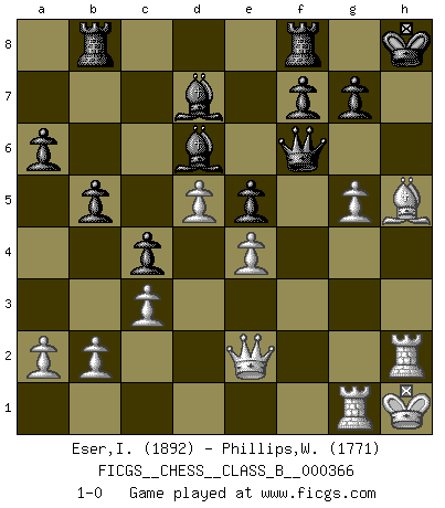 Last move : 1-0 2023 August 16 16:19:46 [Event "FICGS__CHESS__CLASS_B__000366"] [Site "FICGS"] [Date "2023.03.25"] [Round "1"] [White "Eser,Ipekyilmaz"] [Black "Phillips,Wendell"] [Result "1-0"] [WhiteElo "1892"] [BlackElo "1771"] 1.d3 d6 2.d4 c6 3.d5 e5 4.Nc3 h6 5.g3 c5 6.Bg2 a6 7.Kf1 b5 8.e3 Bf5 9.e4 Bc8 10.f3 Ne7 11.f4 Nd7 12.Nf3 exf4 13.gxf4 Ng6 14.h3 Be7 15.Ne2 Nf6 16.Qd3 O-O 17.f5 Ne5 18.Nxe5 dxe5 19.Kg1 Bd6 20.Ng3 c4 21.Qe2 Bd7 22.Rh2 Qb6+ 23.Kh1 Bc5 24.Bf3 Rab8 25.Bd2 Bd4 26.c3 Bc5 27.Nh5 Nxh5 28.Bxh5 Qf6 29.Be3 Bd6 30.Rg1 Kh8 31.h4 Qe7 32.f6 Qxf6 33.Bg5 hxg5 34.hxg5 1-0 Follow this game move after move (download)Some sacrifices are sound; the rest are mine. (Mikhail Tal) Woher wissen wir, daß der Neanderthaler Blindschach gespielt hat? -- Bei Ausgrabungen wurden keine Schachbretter und Figuren gefunden. (Anonymous) Nunca nadie ha ganado una partida de Ajedrez rindiendose. (Unknown) Les ravages du H expliquent la différence de niveau entre Tal et Thal [Abergel]. To send light into the darkness of men's hearts - such is the duty of the artist. (Schumann)