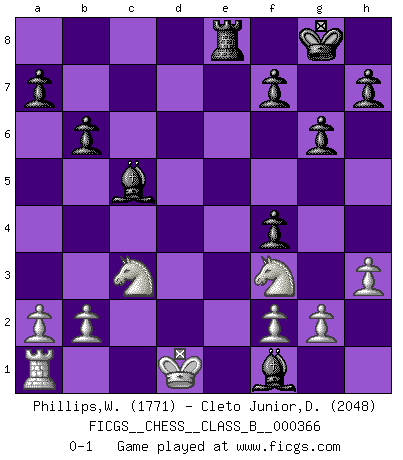 Last move : 0-1 2023 March 27 23:34:41 [Event "FICGS__CHESS__CLASS_B__000366"] [Site "FICGS"] [Date "2023.03.25"] [Round "1"] [White "Phillips,Wendell"] [Black "Cleto Junior,Dirceu"] [Result "0-1"] [WhiteElo "1771"] [BlackElo "2048"] 1.d3 d5 2.Nd2 c5 3.e4 Nf6 4.Be2 e5 5.c3 Be7 6.h3 Nc6 7.Qc2 O-O 8.Nf1 c4 9.exd5 cxd3 10.Bxd3 Nxd5 11.Ng3 g6 12.Nf3 Ndb4 13.cxb4 Nxb4 14.Qc3 Qxd3 15.Qxd3 Nxd3+ 16.Ke2 Nf4+ 17.Bxf4 exf4 18.Ne4 b6 19.Rhd1 Ba6+ 20.Kd2 Rfd8+ 21.Kc2 Rac8+ 22.Nc3 Bc5 23.Rd2 Rxd2+ 24.Kxd2 Rd8+ 25.Ke1 Re8+ 26.Kd1 Bf1 0-1 Follow this game move after move (download)Human affairs are like a Chess game: only those who do not take it seriously can be called good players. (Hung Tzu Ch'eng) Matt entspricht nicht immer den Tatsachen. (Savielly Grigorievitsch Tartakower) Una compensación adecuada por un sacrificio es tener una combinación sólida que conduce a una posición ganadora; una compensación adecuada por una metida de pata es dejar a tu oponente arrebatar una derrota de las fauces de la victoria. (Bruce A. Moon) Dieu déplace le joueur, et celui-ci la pièce. Quel Dieu derrière Dieu commence donc la trame ? Arturo Perez-Reverte (prix de littérature policière 1993). The intuitive mind is a sacred gift; the rational mind is a faithful servant. We have created a society that honors the servant but has forgotten the gift. (Albert Einstein)