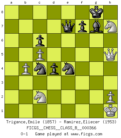 Last move : 0-1 2023 September 23 11:37:6 [Event "FICGS__CHESS__CLASS_B__000366"] [Site "FICGS"] [Date "2023.03.25"] [Round "1"] [White "Trigance,Emile"] [Black "Ramirez,Eliecer"] [Result "0-1"] [WhiteElo "1857"] [BlackElo "1953"] 1.d4 d5 2.c4 c6 3.Nf3 Nf6 4.Nc3 e6 5.e3 Be7 6.Bd3 Qc7 7.c5 Nbd7 8.b4 e5 9.Be2 e4 10.Nd2 O-O 11.O-O b6 12.Nb3 Rd8 13.f4 exf3 14.Bxf3 a5 15.a3 axb4 16.axb4 Rxa1 17.Nxa1 Ba6 18.Be2 Qb7 19.Nc2 Bxe2 20.Qxe2 Re8 21.Qf2 bxc5 22.dxc5 Ne5 23.Qf5 Bd8 24.Ne2 Nc4 25.Ned4 Bc7 26.g4 h6 27.e4 Rxe4 28.Bxh6 Be5 29.Bxg7 Rxg4+ 30.Kh1 Rxg7 31.Nf3 Bc3 32.Rg1 Ne4 33.Rxg7+ Kxg7 34.Ng5 Qe7 35.Qh7+ Kf8 36.Qh6+ Bg7 37.Nh7+ Kg8 38.Qh5 d4 0-1 Follow this game move after move (download)In blitz, the Knight is stronger than the Bishop. (Vlastimil Hort) Alles was ich jemals tun will ist Schach spielen. (Robert James Fischer) No es tiempo de jugar al Ajedrez cuando la casa esta en llamas. (Proverbio Italiano) La solitude du joueur d'Echecs à l'approche du mat est semblable à celle du condamné. (Francis Szpiner) For to win one hundred victories in one hundred battles is not the acme of skill. To subdue the enemy without fighting is the acme of skill. (Sun Tzu)