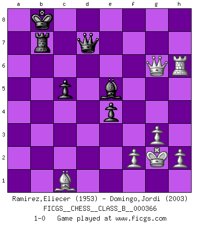 Last move : 1-0 2023 October 5 0:14:27 [Event "FICGS__CHESS__CLASS_B__000366"] [Site "FICGS"] [Date "2023.03.25"] [Round "1"] [White "Ramirez,Eliecer"] [Black "Domingo,Jordi"] [Result "1-0"] [WhiteElo "1953"] [BlackElo "2003"] 1.e4 e5 2.Nf3 f5 3.Nxe5 Nf6 4.Bc4 Qe7 5.d4 Nc6 6.O-O fxe4 7.Bf4 d6 8.Bf7+ Kd8 9.Bb3 Be6 10.Nxc6+ bxc6 11.Nc3 Nd5 12.Nxd5 cxd5 13.Qd2 h6 14.Qa5 g5 15.Be3 Bg7 16.Bxd5 Bxd5 17.Qxd5 Rb8 18.b3 Re8 19.c4 Qd7 20.Qa5 Rb7 21.Rac1 Kc8 22.d5 Kb8 23.b4 Be5 24.a4 Bf4 25.b5 Qf5 26.Qd2 Ka8 27.c5 dxc5 28.Rxc5 h5 29.Rfc1 Bd6 30.Rc6 Re5 31.Qe2 h4 32.b6 Qd7 33.a5 Rxd5 34.Qc4 Be5 35.Qc2 h3 36.Rg6 c5 37.Rxg5 Qc6 38.g3 axb6 39.axb6 Rxb6 40.Rh5 Rb2 41.Qc4 Rb4 42.Qe2 Qe6 43.Rh6 Qd7 44.Rxh3 Rb2 45.Qa6+ Kb8 46.Rh6 Rb7 47.Qg6 Rd1+ 48.Kg2 Rxc1 49.Bxc1 1-0 Follow this game move after move (download)I'm not a materialistic person, in that, I don't suffer the lack or loss of money. The absence of worldly goods I don't look back on. For Chess is a way I can be as materialistic as I want without having to sell my soul. (Jamie Walter Adams) Die meiste Zeit treffe ich auf Gegner, die meine Enkel sein könnten. Ich bin da, um ihnen zu zeigen, dass sie von mir noch einiges lernen können. (Viktor Kortschnoi) Los libros de Ajedrez deben de usarse igual como usamos los anteojos: para mejorar la vista, aunque algunos jugadores los quieren usar como si ellos les otorgaran la vision. (José Raúl Capablanca) Le temps de noter son nom sur la feuille de partie, j'étais déjà en zeitnot ! D'un modeste amateur apparié lors de la première ronde d'un open contre le grand-maître Azmaïparashvili. They misunderestimated me. (George W. Bush, Bentonville nov. 6, 2000)
