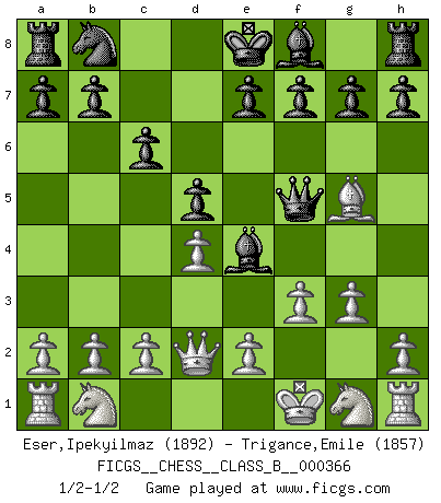 Last move : 1/2-1/2 2023 May 16 15:54:9 [Event "FICGS__CHESS__CLASS_B__000366"] [Site "FICGS"] [Date "2023.03.25"] [Round "1"] [White "Eser,Ipekyilmaz"] [Black "Trigance,Emile"] [Result "1/2-1/2"] [WhiteElo "1892"] [BlackElo "1857"] 1.d3 d5 2.d4 Nf6 3.g3 Bf5 4.Bg2 Qd7 5.Kf1 c6 6.Bg5 Ne4 7.Bxe4 Bxe4 8.f3 Qf5 9.Qd2 1/2-1/2 Follow this game move after move (download)After black's reply to 1.e4 with 1..e5, leaves him always trying to get into the game. (Howard Staunton) Jeder leidlich begabte Spieler, er braucht keineswegs hervorragend veranlagt zu sein, kann es zum Meister bringen. Aber das ist ja auch gar nicht nötig! Der richtige Standpunkt ist es, zu seinem Vergnügen zu spielen, und man glaube ja nicht, dass der Genuss proportional dem Können sei. (Siegbert Tarrasch) Un buen sacrificio es aquel que aunque no sea necesariamente sólido, deja a tu oponente aturdido y confuso. (Rudolph Spielmann) Les échecs, c'est l'art d'analyser. (Mikhail Botvinnik) As the days dwindle down... to a precious few. (Maxwell Anderson)