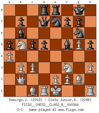 Last move : 0-1 2023 June 26 0:15:0 [Event "FICGS__CHESS__CLASS_B__000366"] [Site "FICGS"] [Date "2023.03.25"] [Round "1"] [White "Domingo,Jordi"] [Black "Cleto Junior,Dirceu"] [Result "0-1"] [WhiteElo "2003"] [BlackElo "2048"] 1.g4 d5 2.h3 h5 3.g5 e5 4.Bg2 Nc6 5.d4 exd4 6.Nf3 Bc5 7.Nbd2 Nge7 8.Nb3 Bb6 9.a4 a5 10.Nbxd4 O-O 11.c3 Ng6 12.Qd3 Nce7 13.Be3 Bd7 14.b3 Re8 15.Rd1 c6 16.Bc1 c5 17.Nb5 Bf5 18.Qd2 Qd7 19.Qb2 Rad8 0-1 This chess game has been lost on time (started : 2023.03.25 12:32:0) Follow this game move after move (download)The passed pawn is a criminal, who should be kept under lock and key. Mild measures, such as police surveillance, are not sufficient. (Nimzovitch) Es ist peinlich, dass ich nie Weltmeister wurde. Es wäre leicht, Leonid Breschnjew als Ursache vorzuschieben, dessen Apparat den Vorzeigekommunisten Anatoli Karpow in allem unterstützte. Aber Garri Kasparow zum Beispiel, der ebenfalls von den Sowjets unerwünscht war, hat trotz der Widerstände den WM-Titel erobert. (Viktor Kortschnoi) El Ajedrez es imaginación. (David Bronstein) Un millionnaire : 'Monsieur Steinitz ! Vous ne participez aux tournois que pour l'argent, alors que moi je n'y viens que pour l'honneur.' Steinitz : 'Chacun joue pour ce qu'il n'a pas'... The only sure thing about luck is that it will change. (Wilson Mizner)