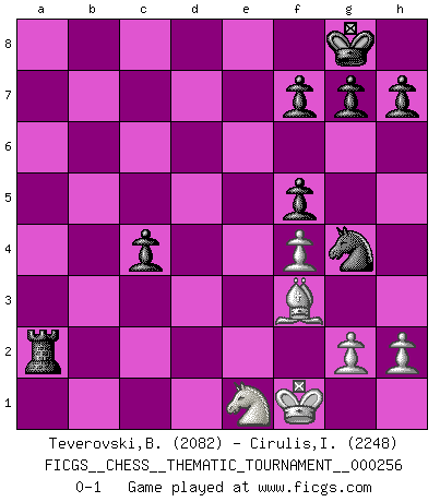 Last move : 0-1 2023 April 18 22:25:19 [Event "FICGS__CHESS__THEMATIC_TOURNAMENT__000256"] [Site "FICGS"] [Date "2023.03.25"] [Round "1"] [White "Teverovski,Bogoljub"] [Black "Cirulis,Ilmars"] [Result "0-1"] [WhiteElo "2082"] [BlackElo "2248"] 1.Nf3 d5 2.b4 Nf6 3.e3 Bf5 4.Bb2 e6 5.b5 Bd6 6.d3 O-O 7.Nbd2 c6 8.a4 Qe7 9.Ne5 cxb5 10.axb5 a5 11.bxa6 Nxa6 12.Be2 Qc7 13.f4 Nb4 14.c4 b5 15.O-O bxc4 16.dxc4 Nc2 17.Rxa8 Rxa8 18.Bd4 Bc5 19.Nb3 Bxd4 20.Nxd4 Nxe3 21.Qc1 Nxf1 22.Kxf1 Qc5 23.Nxf5 exf5 24.Bf3 Ra2 25.Nd3 Qxc4 26.Qxc4 dxc4 27.Ne1 Ng4 0-1 Follow this game move after move (download)Fischer sacrificed virtually everything most of us weakies (to use his term) value, respect, and cherish, for the sake of an artful, often beautiful board game, for the ambivalent privilege of being its greatest master. (Paul Kollar) Wie gewinnt Tal? Er entwickelt alle seine Figuren in die Brettmitte und opfert sie dann irgendwo. (Robert James Fischer) No es suficiente ser un buen jugador, se debe también de jugar bién. (Siegbert Tarrasch) Je menace de comprendre la position. (Anonyme) Perhaps chess is the wrong game for the times (The Chess Master and the Computer, by Garry Kasparov - 2010)