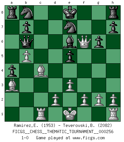 Last move : 1-0 2023 April 5 16:33:13 [Event "FICGS__CHESS__THEMATIC_TOURNAMENT__000256"] [Site "FICGS"] [Date "2023.03.25"] [Round "1"] [White "Ramirez,Eliecer"] [Black "Teverovski,Bogoljub"] [Result "1-0"] [WhiteElo "1953"] [BlackElo "2082"] 1.Nf3 d5 2.b4 e6 3.a3 a5 4.b5 c6 5.e3 Qb6 6.a4 Bd7 7.Na3 Bxa3 8.Bxa3 cxb5 9.axb5 Ne7 10.c4 dxc4 11.Bxc4 f6 12.Rc1 a4 13.Nd4 g6 14.Qf3 e5 15.Ne6 Bxe6 16.Qxf6 1-0 Follow this game move after move (download)Bobby is the finest Chess player this country ever produced. His memory for the moves, his brilliance in dreaming up combinations, and his fierce determination to win are uncanny. (John Collins) Schach ist Kampf, hauptsächlich jedoch gegen die eigenen Fehler. (Savielly Grigorievitsch Tartakower) Yo jugué Ajedrez con el y a veces le pude haber ganado solo que siempre devuelve su última jugada y juega la partida de manera diferente. (Mark Twain) Plusieurs personnes se sont demandées comment Tal faisait pour gagner... En fait, c'est très simple ! Il met ses pièces au centre de l'échiquier et les sacrifie quelque part ! (David Bronstein) To err is human, to shift the blame on someone else is tactical. (Mladen Jankovic)