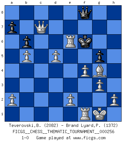Last move : 1-0 2023 April 7 17:42:41 [Event "FICGS__CHESS__THEMATIC_TOURNAMENT__000256"] [Site "FICGS"] [Date "2023.03.25"] [Round "1"] [White "Teverovski,Bogoljub"] [Black "Brand Lyard,Paul"] [Result "1-0"] [WhiteElo "2082"] [BlackElo "1372"] 1.Nf3 d5 2.b4 Bg4 3.Ne5 Bf5 4.Bb2 f6 5.Nf3 e6 6.b5 b6 7.g3 Be4 8.Bg2 Bxf3 9.Bxf3 Bc5 10.O-O Bd6 11.c4 Nd7 12.cxd5 e5 13.d4 Nh6 14.Nd2 O-O 15.Nc4 g5 16.dxe5 fxe5 17.Qc2 Rf6 18.Be4 Qc8 19.Bxh7+ Kh8 20.Rac1 Nc5 21.Nxe5 Bxe5 22.Bxe5 Ng4 23.Bf5 Qf8 24.Bxg4 Kg7 25.Qc3 Re8 26.Bxf6+ Kg6 27.f4 Ne4 28.Qxc7 Kxf6 29.Rc6+ Nd6 30.Rxd6+ Re6 31.Rxe6+ 1-0 Follow this game move after move (download)The hardest game to win is a won game. (Emanuel Lasker) Ich bin es gewohnt, das die Jugend mir überhaupt keinen Respekt entgegenbringt. (Alexander Morozewich) EL Ajedrez es como la vida. (Boris Spassky) Les échecs sont un jeu terrible. Si vous n'avez pas le centre, votre adversaire a une position plus libre. Par contre, si vous avez le centre, alors vous avez vraiment quelque chose pour laquelle vous inquiéter ! (Siegbert Tarrasch) For peace of mind, resign as general manager of the universe. (Douglas Adams)