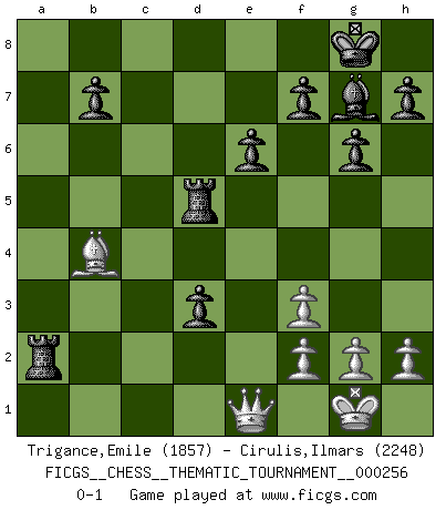 Last move : 0-1 2023 June 9 15:52:19 [Event "FICGS__CHESS__THEMATIC_TOURNAMENT__000256"] [Site "FICGS"] [Date "2023.03.25"] [Round "1"] [White "Trigance,Emile"] [Black "Cirulis,Ilmars"] [Result "0-1"] [WhiteElo "1857"] [BlackElo "2248"] 1.Nf3 d5 2.b4 Bg4 3.Bb2 e6 4.a3 Bxf3 5.exf3 c6 6.c4 Nf6 7.d4 dxc4 8.Bxc4 g6 9.O-O Bg7 10.Nd2 Nbd7 11.Ne4 O-O 12.Rc1 Nb6 13.Bb3 Nbd5 14.Nc5 Qb6 15.Qd2 Rfe8 16.Ne4 Red8 17.Rfd1 a5 18.Nc3 axb4 19.Nxd5 Nxd5 20.Bxd5 bxa3 21.Bc3 Rxd5 22.Rb1 Qa6 23.Ra1 c5 24.Qe1 cxd4 25.Bb4 a2 26.Rd2 d3 27.R1xa2 Qxa2 28.Rxa2 Rxa2 0-1 Follow this game move after move (download)A Chess game is divided into three stages: the first, when you hope you have the advantage, the second when you believe you have an advantage, and the third... when you know you're going to lose ! (Savielly Tartakower) Ich verachte die Medien. (Robert James Fischer) Estaba muy claro de que el punto vulnerable del Gran Maestro Americano (Bobby Fischer) radicaba en las posiciones de doble filo, colgantes, irracionales, donde el siempre falló en encontrar un triunfo aún en una posición de clara victoria. (Efim Geller) Pour se monter efficace, un Cavalier a besoin d'avant-postes ! Les Cavaliers font les meilleurs bloqueurs de pions passés. Lottery : A tax on people who are bad at math. (Author unknown)