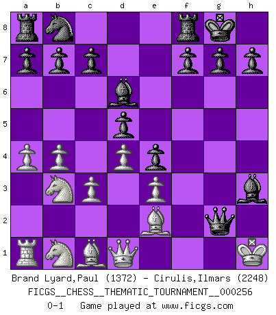 Last move : 0-1 2023 April 3 9:18:36 [Event "FICGS__CHESS__THEMATIC_TOURNAMENT__000256"] [Site "FICGS"] [Date "2023.03.25"] [Round "1"] [White "Brand Lyard,Paul"] [Black "Cirulis,Ilmars"] [Result "0-1"] [WhiteElo "1372"] [BlackElo "2248"] 1.Nf3 d5 2.b4 e6 3.c3 Bd6 4.h3 e5 5.e3 Ne7 6.d4 e4 7.Nfd2 O-O 8.Be2 Nf5 9.g3 Nxg3 10.Nb3 Nxh1 11.a4 Nxf2 12.Kxf2 Qh4+ 13.Kf1 Bxh3+ 14.Kg1 Qg3+ 15.Kh1 Qg2+ 0-1 Follow this game move after move (download)Strategy requires thought, tactics require observation. (Max Euwe) Stil? Ich habe keinen Stil! (Anatoly Karpov) Un buen sacrificio es aquel que aunque no sea necesariamente sólido, deja a tu oponente aturdido y confuso. (Rudolph Spielmann) La tactique est l'élément le plus important du milieu de jeu. (Siegbert Tarrasch) No, I am still playing. (Anatoly Karpov)