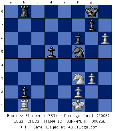 Last move : 0-1 2023 May 26 20:9:45 [Event "FICGS__CHESS__THEMATIC_TOURNAMENT__000256"] [Site "FICGS"] [Date "2023.03.25"] [Round "1"] [White "Ramirez,Eliecer"] [Black "Domingo,Jordi"] [Result "0-1"] [WhiteElo "1953"] [BlackElo "2003"] 1.Nf3 d5 2.b4 Qd6 3.c4 dxc4 4.e3 Qxb4 5.Ba3 Qa5 6.Bxc4 Nf6 7.O-O Nbd7 8.d4 e6 9.Bxf8 Nxf8 10.Nbd2 Ng6 11.Qb1 O-O 12.Rc1 c6 13.Bd3 Rd8 14.Nc4 Qc7 15.a4 c5 16.a5 Rb8 17.Bxg6 hxg6 18.Nce5 b6 19.Ng5 Rf8 20.Ra3 Qd6 21.Rb3 cxd4 22.exd4 Bd7 23.axb6 Rxb6 24.Rxb6 axb6 25.Qd3 b5 26.Rb1 Be8 27.h3 Nd5 28.Ne4 Qd8 29.g3 f6 30.Nf3 Bc6 31.Qb3 Nc7 32.Qc2 Ba8 33.h4 Qd5 34.Ned2 Ne8 35.Qxg6 Nd6 36.h5 Nf5 37.Qg4 Rd8 38.Kf1 Qa2 39.Re1 b4 40.h6 Bxf3 41.Nxf3 b3 42.d5 b2 43.Qe4 Qxd5 44.Qxd5 exd5 45.Rb1 Rb8 0-1 Follow this game move after move (download)Chess is a cold bath for the mind. (Sir John Simon) Rubinstein ist ein Turmendspiel, welches die Götter vor tausenden von Jahren begannen. (Savielly Grigorievitsch Tartakower) No soy una persona materialista y por eso, no resiento la falta o pérdida del dinero. La ausencia de cosas mundanas carece de importancia. Ya que el Ajedrez es una forma en la que puedo ser tan materialista como yo desee sin tener la necesidad de vender mi alma. (Jamie Walter Adams) Dans le domaine de la peinture, de la gravure et de la sculpture, dès la première décennie de notre siècle, les artistes abandonnent la représentation de la partie d'échecs pour se concentrer sur les pièces, sur les échiquiers et sur toutes les variations auxquelles les unes et les autres peuvent donner lieu. On passe en quelque sorte d'un thème social à un thème musical (au sens de la musica médiévale, c'est-à-dire d'une notion qui inclue le rythme, l'harmonie, la construction et la déconstruction, etc.). Graphiquement et picturalement, l'échiquier apparaît comme une structure ouverte, dynamique, d'une richesse infinie, autorisant toutes les combinatoires et débouchant sur des mouvements et des rythmes de nature exponentielle. (Michel Pastoureau) Mandala - that's it! 16x16 squares as multiple of the four and the eight because of the Four Noble Truths and the Noble Eightfold Path. (Heinz-Georg Lehnhoff about Big Chess)