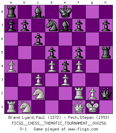 Last move : 0-1 2023 June 15 20:0:51 [Event "FICGS__CHESS__THEMATIC_TOURNAMENT__000256"] [Site "FICGS"] [Date "2023.03.25"] [Round "1"] [White "Brand Lyard,Paul"] [Black "Pech,Stepan"] [Result "0-1"] [WhiteElo "1372"] [BlackElo "1993"] 1.Nf3 d5 2.b4 c6 3.Bb2 Nf6 4.Bxf6 gxf6 5.e3 e5 6.Be2 Bxb4 7.c3 Bd6 8.O-O f5 9.d4 e4 10.Ne1 Nd7 11.h3 Qh4 12.f4 Rg8 13.Nc2 Qxh3 14.Rf2 Be7 15.Qf1 Qg3 16.Kh1 Rg6 17.a4 Rh6+ 18.Bh5 Rxh5+ 19.Kg1 Qh2+ 0-1 Follow this game move after move (download)Chess is 99 percent tactics. (Teichmann) Dieses schreckliche Gefühl, dass ich gegen eine Maschine spielte, die niemals Fehler macht, zerschmetterte meinen Widerstand. (Mark Taimanov) No solamente yo pronostico su triunfo sobre Botvinnik, sino que me adelanto y digo que probablemente Fischer es el jugador de Ajedrez mas grande que haya existido. (John Collins) Le jeu d'échecs fait naître et fortifie en nous plusieurs qualités précieuses dans le cours de l'existence, telles que la prévoyance, la circonspection, la prudence, et la persévérance. (Benjamin Franklin - 1783, la morale des échecs) In every real man a child is hidden that wants to play. (Friedrich Nietzsche)