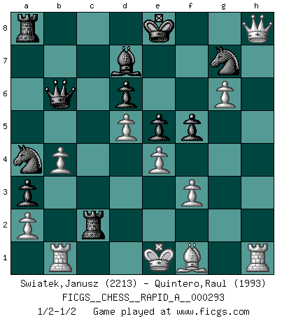 Last move : 1/2-1/2 2023 June 1 0:39:16 [Event "FICGS__CHESS__RAPID_A__000293"] [Site "FICGS"] [Date "2023.04.02"] [Round "1"] [White "Swiatek,Janusz"] [Black "Quintero,Raul"] [Result "1/2-1/2"] [WhiteElo "2213"] [BlackElo "1993"] 1.d4 Nf6 2.c4 d6 3.Nc3 g6 4.e4 Bg7 5.h3 O-O 6.Be3 e5 7.d5 Na6 8.g4 Nc5 9.f3 a5 10.Nge2 c6 11.Qd2 cxd5 12.cxd5 Bd7 13.Ng3 a4 14.h4 Qa5 15.h5 Rfc8 16.hxg6 fxg6 17.g5 Ne8 18.Rb1 b5 19.Qh2 b4 20.Qxh7+ Kf7 21.Bd2 bxc3 22.Bxc3 Qb6 23.Bd2 a3 24.b4 Na4 25.Nf5 gxf5 26.g6+ Kf8 27.Bh6 Rc2 28.Bxg7+ Nxg7 29.Qh8+ Ke7 30.Qh4+ Ke8 31.Qh8+ 1/2-1/2 Follow this game move after move (download)There must have been a time when men were demigods, or they could not have invented Chess. (Gustav Schenk) Der beste Spieler in einem Turnier gewinnt es nie. Er landet auf Platz zwei oder drei. (Siegbert Tarrasch) Buenas posiciones no logran ganar juegos, buenas movidas sí. (Gerald Abrahams) Vous m'avez demandé de vous exposer quel est le fondement de la prière. Je ne fais que préparer les pièces du jeu sur la table... Nous sera-t-il permis d'en adopter les règles et si nous les appliquons scrupuleusement nous ne tarderons pas à faire mat le Roi divin ! Il ne pourra échapper à nos mains. (Sainte Thérèse d'Avila, Chemin de perfection) The production of too many useful things results in too many useless people. (Karl Marx)