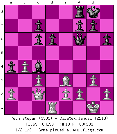 Last move : 1/2-1/2 2023 June 14 0:47:15 [Event "FICGS__CHESS__RAPID_A__000293"] [Site "FICGS"] [Date "2023.04.02"] [Round "1"] [White "Pech,Stepan"] [Black "Swiatek,Janusz"] [Result "1/2-1/2"] [WhiteElo "1993"] [BlackElo "2213"] 1.c4 e5 2.Nc3 Nf6 3.Nf3 Nc6 4.g3 Bb4 5.Bg2 O-O 6.O-O e4 7.Ne1 Bxc3 8.dxc3 h6 9.Nc2 d6 10.Ne3 a5 11.Qc2 a4 12.Rd1 Ra5 13.Nd5 Be6 14.Nxf6+ Qxf6 15.Be3 Bxc4 16.b3 Be6 17.b4 Rd5 18.Bxe4 Rxd1+ 19.Rxd1 Bc4 20.Bxc6 bxc6 1/2-1/2 Follow this game move after move (download)A chess genius has died; a loss for humanity. (Viktor Kortchnoi, about Bobby Fischer's death) Er war ein guter Schachspieler, aber ich kann Leute nicht ausstehen, die 'Heil Hitler' rufen (Über Alexander Aljechin). (Miguel Najdorf) Cuando veas una buena jugada, trata de encontrar otra mejor. (Emanuel Lasker) Pour se monter efficace, un Cavalier a besoin d'avant-postes ! Les Cavaliers font les meilleurs bloqueurs de pions passés. True nature is revealed in times of difficulty. (Chinese proverb)