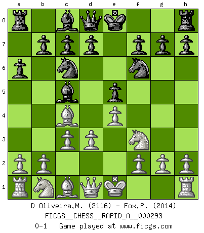 Last move : 0-1 2023 May 8 21:47:54 [Event "FICGS__CHESS__RAPID_A__000293"] [Site "FICGS"] [Date "2023.04.02"] [Round "1"] [White "D Oliveira,Marcos Arruda"] [Black "Fox,Paul"] [Result "0-1"] [WhiteElo "2116"] [BlackElo "2014"] 1.e4 e5 2.Nf3 Nc6 3.Bc4 Nf6 4.d3 Bc5 5.c3 a6 0-1 This chess game has been lost on time (started : 2023.04.02 19:17:16) Follow this game move after move (download)Your body has to be in top condition. Your Chess deteriorates as your body does. You can't separate body from mind. (Bobby Fischer) Mit sehr nachdenklichem Gesicht schreitet Bobby durch den Turniersaal. Was ist passiert?, fragt Lombardy. Ich stehe schlecht, antwortet Fischer. Lombardy: Dann biete doch einfach Remis an. Fischer: So schlecht stehe ich nun auch wieder nicht! (Robert James Fischer) La táctica fluye a partir de una posición superior. (Bobby Fischer) Les Echecs ont trois composantes : le temps, l'espace et le matériel en dernier. (Mikhail Tal) Perfection is achieved, not when there is nothing more to add, but when there is nothing left to take away. (Antoine de Saint-Exupéry)
