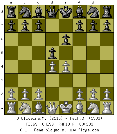 Last move : 0-1 2023 May 11 2:43:23 [Event "FICGS__CHESS__RAPID_A__000293"] [Site "FICGS"] [Date "2023.04.02"] [Round "1"] [White "D Oliveira,Marcos Arruda"] [Black "Pech,Stepan"] [Result "0-1"] [WhiteElo "2116"] [BlackElo "1993"] 1.e4 e6 2.d4 d5 0-1 This chess game has been lost on time (started : 2023.04.02 19:17:16) Follow this game move after move (download)In Fischer's hands, a slight theoretical advantage is as good a being a Queen ahead. (Isaac Kashdan) Ich kenne keine einzige Person, die behaupten würde, Garri Kasparow sei ein guter Mensch (Nigel Short) Hay jugadores fuertes y personas amables y yo soy un jugador fuerte. (Bobby Fischer) Il vaut toujours mieux jouer un plan faux de façon logique que de n'avoir pas de plan du tout. (Victor Kortchnoï) Humor is by far the most significant activity of the human brain. (Edward De Bono)