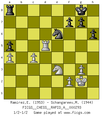 Last move : 1/2-1/2 2023 April 23 14:19:15 [Event "FICGS__CHESS__RAPID_A__000293"] [Site "FICGS"] [Date "2023.04.02"] [Round "1"] [White "Ramirez,Eliecer"] [Black "Schangareev,Mirzian"] [Result "1/2-1/2"] [WhiteElo "1953"] [BlackElo "1944"] 1.e4 e5 2.Nf3 Nc6 3.Bb5 Nf6 4.O-O Nxe4 5.d4 Be7 6.Qe2 Nd6 7.Bxc6 bxc6 8.dxe5 Nb7 9.Nc3 O-O 10.Re1 Re8 11.Qc4 Nc5 12.Bg5 d5 13.exd6 cxd6 14.Rad1 Bxg5 15.Nxg5 Rxe1+ 16.Rxe1 Ne6 17.Qxc6 Rb8 18.Nge4 Rb6 19.Qc4 Rxb2 20.Rd1 Nf8 21.Nxd6 Be6 22.Qd3 h6 23.a4 Ng6 24.Nd5 Qg5 25.Ne3 Nf4 26.Qe4 a5 27.h4 Qxh4 28.g3 Nh3+ 29.Kg2 Qxe4+ 30.Nxe4 Ng5 31.Nc5 Rb8 32.Nxe6 Nxe6 33.Rd5 Ra8 34.c4 1/2-1/2 Follow this game move after move (download)Chess is war over the board. The object is to crush the opponents mind. (Bobby Fischer) Das Blackmar-Diemer-Gambit verändert den ganzen Menschen! (Emil Joseph Diemer) Yo considero que Fischer es uno de los expertos mas grandes de aperturas de siempre. (Keith Hayward) À la honte des hommes, on sait que les lois du jeu sont les seules qui soient partout justes, claires, inviolables et exécutées. Pourquoi l'Indien qui a donné les règles du jeu d'échecs est-il obéi de bon gré dans toute la terre, et que les décrétales des papes, par exemple, sont aujourd'hui un objet d'horreur et de mépris ? C'est que l'inventeur des échecs combina tout avec justesse pour la satisfaction des joueurs, et que les papes, dans leurs décrétales, n'eurent en vue que leur seul avantage. L'Indien voulut exercer également l'esprit des hommes et leur donner du plaisir; les papes ont voulu abrutir l'esprit des hommes. Voltaire (Dictionnaire philosophique / Garnier 1967) The modern world has divided itself into Conservatives and Progressives. The business of Progressives is to go on making mistakes. The business of the Conservatives is to prevent the mistakes from being corrected. (G.K. Chesterton)