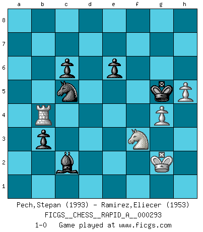 Last move : 1-0 2023 August 5 13:15:29 [Event "FICGS__CHESS__RAPID_A__000293"] [Site "FICGS"] [Date "2023.04.02"] [Round "1"] [White "Pech,Stepan"] [Black "Ramirez,Eliecer"] [Result "1-0"] [WhiteElo "1993"] [BlackElo "1953"] 1.d4 d5 2.c4 c6 3.Nf3 Nf6 4.Nc3 e6 5.e3 Nbd7 6.Qc2 Bd6 7.Bd3 O-O 8.O-O dxc4 9.Bxc4 b5 10.Bd3 Bb7 11.a3 a6 12.b4 a5 13.Rb1 axb4 14.axb4 Qe7 15.e4 e5 16.Ne2 Bxb4 17.Ng3 g6 18.dxe5 Ng4 19.e6 fxe6 20.Bg5 Qc5 21.Qb3 Nge5 22.Nxe5 Qxe5 23.Bh6 Be7 24.Bxf8 Rxf8 25.Qc2 Nc5 26.Rbd1 Bd6 27.f4 Rxf4 28.Rxf4 Qxf4 29.e5 Qd4+ 30.Kh1 Qxe5 31.Bxg6 hxg6 32.Qxg6+ Qg7 33.Qxg7+ Kxg7 34.Rxd6 Kf6 35.h4 b4 36.Rd4 b3 37.Rb4 Ba6 38.Kg1 Ke5 39.Nf1 Be2 40.Nd2 Bd1 41.g4 Bc2 42.h5 Kf6 43.Kg2 Kg5 44.Nf3+ 1-0 Follow this game move after move (download)No one ever won a game by resigning. (Unknown) Wenn man heute mit 14 Jahren noch kein GM ist, kann man es vergessen. (Viswanathan Anand) Te sientas frente a un tablero y repentinamente tu corazón brinca. Tu mano tiembla al tomar una pieza y moverla. Pero lo que el Ajedrez te enseña es que tu debes permanecer ahí con calma y pensar de que si realmente es una buena idea o de que si hay otras ideas mejores. (Stanley Kubrick) Les sacrifices démontrent seulement que quelqu'un a gaffé. (Savielly Tartacover) How many people work in NATO Headquarters ? - About half of them. (Dirk Stikker, NATO general secretary)