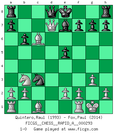 Last move : 1-0 2023 April 6 10:48:51 [Event "FICGS__CHESS__RAPID_A__000293"] [Site "FICGS"] [Date "2023.04.02"] [Round "1"] [White "Quintero,Raul"] [Black "Fox,Paul"] [Result "1-0"] [WhiteElo "1993"] [BlackElo "2014"] 1.Nf3 Nf6 2.g3 e6 3.d4 c5 4.Bg2 cxd4 5.Nxd4 d5 6.O-O e5 7.Nb3 Be6 8.c4 Nc6 9.cxd5 Nxd5 10.N1d2 Be7 11.Ne4 b6 12.Nc3 Nxc3 13.Bxc6+ Bd7 14.Qxd7+ 1-0 Follow this game move after move (download)You can only get good at Chess if you love the game. (Bobby Fischer) Ich kenne Menschen, die allen Willen der Welt besitzen und doch nicht Schach spielen können. (Robert James Fischer) Mis oponentes también hacen buenas movidas. A veces yo no tomo esas cosas en consideración. (Bobby Fischer) Vous savez, camarade Pachman, je n'éprouve pas de plaisir à être ministre, je jouerais plutôt aux échecs comme vous, ou alors ferais une révolution au Venezuela. (Che Guevara à Ludek Pachman, 'Checkmate in Prague', 1975) Creativity is allowing yourself to make mistakes. Art is knowing which ones to keep. (Scott Adams)