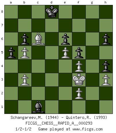 Last move : 1/2-1/2 2023 May 1 15:0:40 [Event "FICGS__CHESS__RAPID_A__000293"] [Site "FICGS"] [Date "2023.04.02"] [Round "1"] [White "Schangareev,Mirzian"] [Black "Quintero,Raul"] [Result "1/2-1/2"] [WhiteElo "1944"] [BlackElo "1993"] 1.d4 Nf6 2.c4 e6 3.g3 d5 4.Nf3 Bb4+ 5.Bd2 Be7 6.Bg2 c6 7.O-O O-O 8.Bf4 dxc4 9.Ne5 Nd5 10.Nxc4 Nxf4 11.gxf4 Nd7 12.Nc3 Nb6 13.Ne5 f6 14.Nf3 Kh8 15.Ne4 Nd5 16.e3 Bd7 17.Qc2 Qe8 18.a3 Qg6 19.Kh1 b6 20.Rg1 Rac8 21.Rac1 Rfd8 22.Nfd2 c5 23.dxc5 f5 24.Nc3 Nxc3 25.Qxc3 Rxc5 26.Qb3 Rdc8 27.Rxc5 Rxc5 28.Nc4 Bf6 29.Nd6 Qh5 30.a4 h6 31.e4 Qh4 32.e5 Bd8 33.Qd3 Rc7 34.Nb5 Bxb5 35.axb5 g6 36.Bc6 Rg7 37.Qg3 g5 38.Qxh4 gxh4 39.Rxg7 Kxg7 40.Kg2 Be7 41.Kf3 Bb4 42.Ke2 Kf7 43.h3 Ke7 44.Bb7 Kd7 45.Ba8 Kc8 46.Bc6 Kd8 47.Kd3 Bc5 48.Ke2 Bd4 49.b3 Bb2 50.Ke3 Bc1+ 51.Kf3 Bd2 52.Ba8 Kc7 53.Bc6 a5 54.Be8 Kd8 55.Bc6 Bc1 56.Bb7 Kd7 57.Bc6+ Kd8 58.Ba8 Kc8 59.Bc6 Kd8 1/2-1/2 Follow this game move after move (download)Only sissies Castle. (Rob Sillars) Du weisst es gibt ein Problem mit Computern und Fernschach, wenn jeder eine Rating von 2450 hat. (John Christen Knudsen) Diferente gente reacciona diferentemente en aceptar la derrota. (Bobby Fischer) Si le désir cupide (et stupide) de gagner est une inépuisable source de souffrance, une combinaison brillante sur l'échiquier est une découverte : le coquelicot qui s'épanouit lorsque apparaît la Voie Lactée. (Arrabal) Nobody is always a winner, and anybody who says he is, is either a liar or doesn't play poker. (Amarillo Slim)