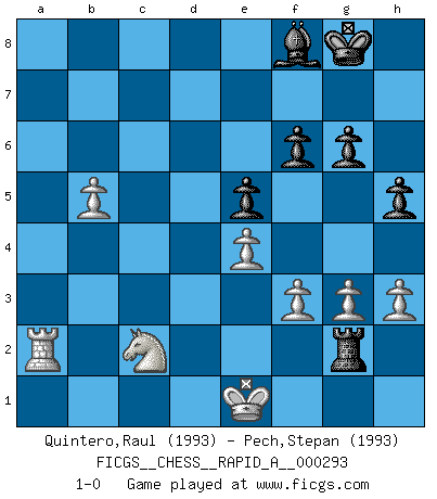 Last move : 1-0 2023 July 28 2:19:12 [Event "FICGS__CHESS__RAPID_A__000293"] [Site "FICGS"] [Date "2023.04.02"] [Round "1"] [White "Quintero,Raul"] [Black "Pech,Stepan"] [Result "1-0"] [WhiteElo "1993"] [BlackElo "1993"] 1.Nf3 d5 2.c4 c6 3.e3 Nf6 4.Nc3 e6 5.d4 Nbd7 6.Qc2 Bd6 7.Bd3 dxc4 8.Bxc4 O-O 9.O-O a6 10.e4 e5 11.h3 b5 12.Bb3 c5 13.dxc5 Nxc5 14.Bg5 Nxb3 15.Qxb3 Be6 16.Bxf6 Qxf6 17.Nd5 Bxd5 18.Qxd5 Rfd8 19.Rac1 Bf8 20.Qc6 Qxc6 21.Rxc6 Rac8 22.Rxa6 f6 23.a3 b4 24.axb4 Rc4 25.Re1 Rxb4 26.Re2 Rdb8 27.Ra2 Rc8 28.Ne1 R8c4 29.f3 Rc1 30.Kf1 Rd4 31.Rc2 Rxc2 32.Nxc2 Rd2 33.b4 h5 34.g3 g6 35.Ke1 Rg2 36.b5 1-0 Follow this game move after move (download)Fischer is under obligation to nobody. (Joseph Platz) Glücklicherweise sind Großmeister Ruben Fines reine Schachbücher weniger phallozentrisch [als seine Schachpsychologie] und deswegen auch weniger lächerlich. (Nigel Short) Si yo gano un torneo, yo lo gano por mí mismo. Yo hago las jugadas. Nadie me ayuda. (Bobby Fischer) Karpov est une pièce de musée. (Garry Kasparov) Luck has a peculiar habit of favoring those who don't depend on it. (Author unknown)