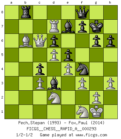 Last move : 1/2-1/2 2023 August 3 3:32:55 [Event "FICGS__CHESS__RAPID_A__000293"] [Site "FICGS"] [Date "2023.04.02"] [Round "1"] [White "Pech,Stepan"] [Black "Fox,Paul"] [Result "1/2-1/2"] [WhiteElo "1993"] [BlackElo "2014"] 1.e4 e5 2.Nf3 Nc6 3.Bb5 a6 4.Ba4 Nf6 5.O-O Be7 6.Re1 b5 7.Bb3 O-O 8.c3 d6 9.h3 Re8 10.d4 Bb7 11.Nbd2 h6 12.Nf1 Bf8 13.Ng3 Na5 14.Bc2 Nc4 15.b3 Nb6 16.Bd2 c5 17.d5 c4 18.b4 Qc7 19.a4 bxa4 20.Bxa4 Reb8 21.Bc2 a5 22.bxa5 Nbd7 23.Be3 Rxa5 24.Rxa5 Qxa5 25.Qa1 Qc7 26.Nd2 Nc5 27.Rb1 Ra8 28.Qb2 Ba6 29.Ra1 g6 30.Qc1 Qc8 31.Ba4 Rb8 32.Qc2 Nxa4 33.Rxa4 Nd7 34.Ngf1 Kg7 35.Qa2 Bb5 36.Ra5 Be7 37.Qb2 Ba4 38.Qc1 Bb5 39.Qb1 Ba4 40.Qc1 Bb5 41.Qb2 Ba4 42.Qa3 Bc2 43.Ra7 Qd8 44.Qa6 Bd3 45.Qc6 Nf6 46.f3 Nh5 47.Rd7 Qf8 48.Bb6 Nf4 1/2-1/2 Follow this game move after move (download)If Chess is a science, it's a most inexact one. If Chess is an art, it is too exacting to be seen as one. If Chess is a sport, it's too esoteric. If Chess is a game, it's too demanding to be just a game. If Chess is a mistress, she's a demanding one. If Chess is a passion, it's a rewarding one. If Chess is life, it's a sad one. (Unknown) Wenn Capablanka heute auf der Schachbühne erscheinen würde, hätte er ein halbes Jahr gebraucht um sich die Schachtheorie anzueignen. Und dann hätte er alles und jeden besiegt. (Mikhail Moiseyevich Botvinik) ¿Cual es el objetivo de jugar una apertura de gambito?... Para adquirir una reputación de ser un jugador apuesto a costo de perder el juego. (Siegbert Tarrasch) Aucun coup ne doit être joué sans but. (Pedro Damiano) It's not the will to win, but the will to prepare to win that makes the difference. (Bear Bryant)