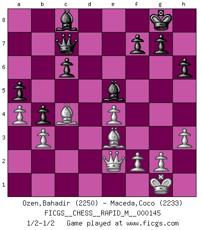 Last move : 1/2-1/2 2023 May 7 0:11:19 [Event "FICGS__CHESS__RAPID_M__000145"] [Site "FICGS"] [Date "2023.04.05"] [Round "1"] [White "Ozen,Bahadir"] [Black "Maceda,Coco"] [Result "1/2-1/2"] [WhiteElo "2250"] [BlackElo "2233"] 1.Nf3 Nf6 2.c4 e6 3.Nc3 d5 4.d4 c6 5.e3 Nbd7 6.Bd3 dxc4 7.Bxc4 b5 8.Bd3 Bb7 9.a3 Bd6 10.O-O O-O 11.Qc2 a5 12.e4 e5 13.dxe5 Nxe5 14.Nxe5 Bxe5 15.h3 h6 16.Be3 Re8 17.Rfd1 Qc7 18.Rac1 Rad8 19.a4 b4 20.Ne2 Nh5 21.b3 Nf4 22.Bc4 Bc8 23.Rxd8 Rxd8 24.Rd1 Rxd1+ 25.Qxd1 Nxe2+ 26.Qxe2 1/2-1/2 Follow this game move after move (download)Chess is the art of analysis. (Mikhail Botvinnik) Frage des Reporters: -Worin besteht das Ziel von Gambiteröffnungen? Antwort: -Auf Kosten der Partie einen Ruf als Angriffspieler zu erwerben.- (Siegbert Tarrasch) Hay jugadores fuertes y personas amables y yo soy un jugador fuerte. (Bobby Fischer) La guerre est enfant de la passion, la passion est enfant du narcissisme et le narcissisme est l'enfant. (...) Une autre partie ? (Thibault de Vassal) The human is the only animal species whose members are able to talk themselves into difficulties that would not otherwise exist. (Wendell Johnson)