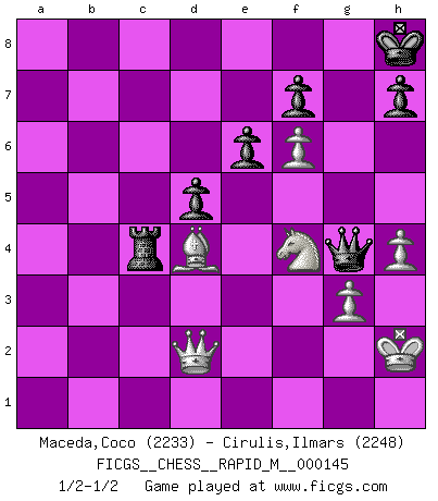 Last move : 1/2-1/2 2023 May 11 3:7:43 [Event "FICGS__CHESS__RAPID_M__000145"] [Site "FICGS"] [Date "2023.04.05"] [Round "1"] [White "Maceda,Coco"] [Black "Cirulis,Ilmars"] [Result "1/2-1/2"] [WhiteElo "2233"] [BlackElo "2248"] 1.e4 e6 2.d4 d5 3.Nc3 Nf6 4.e5 Nfd7 5.f4 c5 6.Nf3 Nc6 7.Be3 cxd4 8.Nxd4 Qb6 9.Qd2 Qxb2 10.Rb1 Qa3 11.Bb5 Nxd4 12.Bxd4 a6 13.Bxd7+ Bxd7 14.Rb3 Qe7 15.Rxb7 Rc8 16.O-O Qd8 17.Qe3 Rc4 18.Rfb1 Be7 19.f5 Bg5 20.Qd3 O-O 21.f6 Bc6 22.Bb6 Qe8 23.Re7 Qb8 24.Bd4 Rb4 25.Rb3 a5 26.Ne2 gxf6 27.Qg3 Kh8 28.a3 Rxb3 29.cxb3 Bb5 30.Nc3 Bc6 31.exf6 Qf4 32.Ne2 Qe4 33.h4 Bh6 34.Qf2 Be8 35.Nc3 Qg4 36.g3 Rg8 37.Kh2 Bd2 38.Rxe8 Rxe8 39.Qxd2 Rb8 40.b4 axb4 41.axb4 Rxb4 42.Ne2 Ra4 43.Nf4 Rc4 1/2-1/2 Follow this game move after move (download)I play correspondence chess because it is both art and science while chess is art only. (A player at FICGS) Ich brauche nur einen Blick auf das Schachbrett zu werfen, und weiß schon, was in der Stellung steckt, was geschehen kann und was geschehen wird. Alle übrigen suchen und prüfen, ich aber weiß es! (José Raúl Capablanca) En manos de Fischer's, una diminuta ventaja teórica es tan buena como tener una Reina de ventaja. (Isaac Kashdan) Dans le domaine de la peinture, de la gravure et de la sculpture, dès la première décennie de notre siècle, les artistes abandonnent la représentation de la partie d'échecs pour se concentrer sur les pièces, sur les échiquiers et sur toutes les variations auxquelles les unes et les autres peuvent donner lieu. On passe en quelque sorte d'un thème social à un thème musical (au sens de la musica médiévale, c'est-à-dire d'une notion qui inclue le rythme, l'harmonie, la construction et la déconstruction, etc.). Graphiquement et picturalement, l'échiquier apparaît comme une structure ouverte, dynamique, d'une richesse infinie, autorisant toutes les combinatoires et débouchant sur des mouvements et des rythmes de nature exponentielle. (Michel Pastoureau) Mac users swear by their computers. PC users swear at their computers. (Author unknown)
