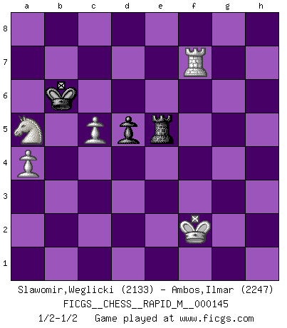 Last move : 1/2-1/2 2023 June 21 20:36:9 [Event "FICGS__CHESS__RAPID_M__000145"] [Site "FICGS"] [Date "2023.04.05"] [Round "1"] [White "Slawomir,Weglicki"] [Black "Ambos,Ilmar"] [Result "1/2-1/2"] [WhiteElo "2133"] [BlackElo "2247"] 1.e4 c6 2.d4 d5 3.e5 Bf5 4.Nf3 e6 5.Be2 Nd7 6.O-O h6 7.a4 a5 8.c3 Ne7 9.Na3 Bh7 10.b3 Qb6 11.Ra2 Nf5 12.Bd3 Bg6 13.Re2 Nb8 14.g3 Na6 15.Kg2 Be7 16.Rd2 Nc7 17.g4 Nh4+ 18.Nxh4 Bxd3 19.Rxd3 Bxh4 20.c4 Qa6 21.f4 Be7 22.c5 b6 23.cxb6 Qxb6 24.f5 c5 25.h4 h5 26.dxc5 Qb4 27.Rf4 Qxc5 28.Nc2 hxg4 29.Ba3 Qb6 30.Bxe7 Kxe7 31.Qxg4 exf5 32.Qxf5 Qg6+ 33.Qxg6 fxg6 34.Rdf3 Ne6 35.Rf7+ Ke8 36.Na3 Rf8 37.Nb5 Rxf7 38.Nd6+ Kd7 39.Rxf7+ Kc6 40.Re7 Nd4 41.Rxg7 Ne6 42.Re7 Nd4 43.Rg7 Ne6 44.Rf7 Rh8 45.Rf6 Kd7 46.Rf7+ Kc6 47.Kg3 g5 48.hxg5 Rg8 49.Nb7 Rxg5+ 50.Kf2 Rxe5 51.Nxa5+ Kb6 52.b4 Nc5 53.bxc5+ 1/2-1/2 Follow this game move after move (download)It is always better to sacrifice your opponent's men. (Savielly Tartakower) Aljechin war kein Nazi. Er war ein Opportunist. Ein schrecklicher Mann. Er liebte Geld über alles und würde für Geld ein Jude, ein Katolik oder ein Protestant werden. (Miguel Najdorf) El Ajedrez es 99 por ciento táctica. (Teichmann) Le succès, c'est être capable d'aller d'échec en échec sans perdre son enthousiasme. (Winston Churchill) I take risks, sometimes patients die, but not taking risks causes more patients to die. So I guess my biggest problem is I've been cursed with the ability to do the math. (Gregory House, House M.D.)