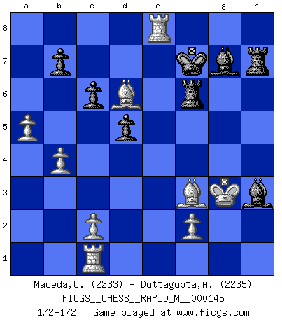 Last move : 1/2-1/2 2023 July 5 5:2:5 [Event "FICGS__CHESS__RAPID_M__000145"] [Site "FICGS"] [Date "2023.04.05"] [Round "1"] [White "Maceda,Coco"] [Black "Duttagupta,Aniruddha"] [Result "1/2-1/2"] [WhiteElo "2233"] [BlackElo "2235"] 1.e4 e5 2.Nc3 Nf6 3.Nf3 Nc6 4.Bb5 Nd4 5.Nxd4 exd4 6.e5 dxc3 7.exf6 Qxf6 8.dxc3 Bc5 9.Qe2+ Qe6 10.O-O Qxe2 11.Bxe2 d6 12.Bf3 O-O 13.Re1 a5 14.Bd2 c6 15.a4 d5 16.h3 h6 17.Rac1 Rd8 18.g4 f5 19.g5 f4 20.gxh6 Bxh3 21.b4 axb4 22.cxb4 Bf8 23.a5 Rd6 24.hxg7 Bxg7 25.Kh2 Rh6 26.Bxf4 Rh7 27.Kg3 Rf8 28.Bd6 Rf6 29.Re8+ Kf7 30.Re7+ Kg8 31.Re8+ Kf7 1/2-1/2 Follow this game move after move (download)Blessed be the memory of him who gave the world this immortal game. (A. G. Gardiner) Ich glaube, ich kenne inzwischen die Gründe für mein Versagen: schachliche Charakterfehler. Ich war nie ein Wunderkind und in meiner gesamten menschlichen Entwicklung immer zu langsam. (Viktor Kortschnoi) El Ajedrez es de 30 a 40 por ciento psicología. Uno no cuenta con esto cuando se juega contra una computadora. No lo puedo confundir. (Judith Polgar) La victoire dans une partie d'Echecs appartient la plupart du temps à celui qui voit un peu plus loin que l'adversaire. (Lasker) Heh, heh, heh. Time to abandon ship. (General Grievous in Star Wars ep.3)