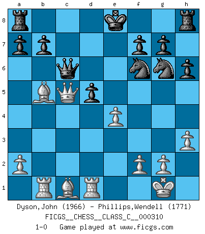 Last move : 1-0 2023 April 16 0:41:23 [Event "FICGS__CHESS__CLASS_C__000310"] [Site "FICGS"] [Date "2023.04.08"] [Round "1"] [White "Dyson,John"] [Black "Phillips,Wendell"] [Result "1-0"] [WhiteElo "1966"] [BlackElo "1771"] 1.e4 d6 2.d4 c6 3.c4 Nd7 4.Be2 e5 5.Nf3 Be7 6.O-O h6 7.Qc2 Qc7 8.Nc3 Nf8 9.Rd1 Ng6 10.b4 Nf6 11.Rb1 Be6 12.h3 Qc8 13.c5 exd4 14.Nxd4 dxc5 15.bxc5 Bxc5 16.Nxe6 Qxe6 17.Nd5 cxd5 18.Qxc5 Qc6 19.Bb5 1-0 Follow this game move after move (download)Chess is mental torture. (Garry Kasparov) Mein Name ist Rustam Kamsky. Sie haben meinen Sohn belästigt. Bereiten Sie sich aufs Sterben vor. (Rustam Kamsky) Realmente no sabemos como el juego fue inventado, aunque hay sospechas. Tan pronto como descubramos a los culpables, se los haremos saber. (Bruce Pandolfini) Aux échecs, les retours au sommet sont rares : les dommages psychologiques consécutifs à une défaite sont trop sévères. (Daily Telegraph) As a goal marker shodan is important. As a destination it is a poor place to stop. (Thomas Tamayo)
