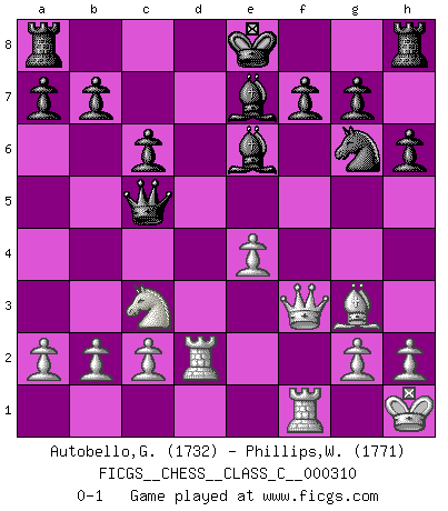 Last move : 0-1 2023 June 28 2:46:35 [Event "FICGS__CHESS__CLASS_C__000310"] [Site "FICGS"] [Date "2023.04.08"] [Round "1"] [White "Autobello,Giovanni"] [Black "Phillips,Wendell"] [Result "0-1"] [WhiteElo "1732"] [BlackElo "1771"] 1.e4 d6 2.d4 h6 3.f4 c6 4.Nf3 Qc7 5.Nc3 Nd7 6.Bc4 e5 7.fxe5 dxe5 8.dxe5 Nxe5 9.Nxe5 Qxe5 10.O-O Qc5+ 11.Kh1 Qxc4 12.Qf3 Be6 13.Bf4 Ne7 14.Rad1 Ng6 15.Bg3 Qc5 16.Rd2 Be7 0-1 This chess game has been lost on time (started : 2023.04.08 4:19:17) Follow this game move after move (download)Chess, like love, like music, has the power to make people happy. (Siegbert Tarrasch) Ich kenne Menschen, die allen Willen der Welt besitzen und doch nicht Schach spielen können. (Robert James Fischer) El jugador de combinación piensa hacia adelante; comienza de la posición dada y trabaja las movidas contundentes en su mente. (Emanuel Lasker) Karpov est une pièce de musée. (Garry Kasparov) When the going gets tactical, the computers get going. (Hyatt)