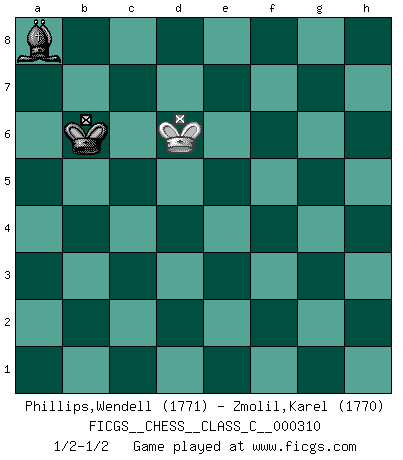 Last move : 1/2-1/2 2023 April 17 14:16:38 [Event "FICGS__CHESS__CLASS_C__000310"] [Site "FICGS"] [Date "2023.04.08"] [Round "1"] [White "Phillips,Wendell"] [Black "Zmolil,Karel"] [Result "1/2-1/2"] [WhiteElo "1771"] [BlackElo "1770"] 1.d3 d5 2.Nd2 e5 3.e4 dxe4 4.dxe4 Be6 5.c3 Nf6 6.Be2 Bc5 7.h3 O-O 8.Qc2 Nc6 9.Nf1 h6 10.Ng3 Qd7 11.Nf3 a6 12.Bd2 Rad8 13.Qc1 Kh7 14.Be3 Bd6 15.b4 Na7 16.Nh2 Nc8 17.Ng4 Ng8 18.Nh2 Nce7 19.Nf3 f5 20.exf5 Nxf5 21.Ne4 Nxe3 22.Qxe3 Qf7 23.a3 Nf6 24.Nxd6 cxd6 25.O-O e4 26.Nd2 d5 27.Rfd1 Rd7 28.Nf1 Rfd8 29.Ng3 g5 30.Rd4 b5 31.a4 Rb7 32.a5 Rc8 33.Rc1 Nd7 34.Nxe4 Qe7 35.Ng3 Nf6 36.Re1 Re8 37.Bf3 Bf7 38.Qxe7 Rbxe7 39.Rxe7 Rxe7 40.Nf5 Re5 41.Ne3 Be6 42.Kf1 Ne4 43.Bxe4+ Rxe4 44.Rxe4 dxe4 45.Ke2 Kg6 46.Nd1 Kf5 47.Ne3+ Kg6 48.g4 Bb3 49.Kd2 Be6 50.Nf1 Kf6 51.Ng3 Bc4 52.Nxe4+ Ke5 53.Ke3 Bf1 54.Nc5 Kd5 55.Nxa6 Bxh3 56.f3 Bf1 57.Nc5 Kc6 58.Ke4 Be2 59.Ke3 Bc4 60.f4 gxf4+ 61.Kxf4 Be2 62.Kg3 Bd1 63.Kh4 Bf3 64.Kh5 Kd5 65.Kxh6 Bxg4 66.a6 Kc4 67.Kg5 Bf3 68.Nb7 Kxc3 69.Nd6 Kxb4 70.Nxb5 Kxb5 71.a7 Ka6 72.Kf4 Ba8 73.Ke5 Kxa7 74.Kd6 Kb6 1/2-1/2 Follow this game move after move (download)A good player is always lucky. (Jose Raul Capablanca) Wenn Du absolut nicht mehr weißt, was Du tun sollst, dann ist es Zeit für Panik. (John van der Wiel) El Ajedrez no es como la vida... ¡tiene reglas!. (Mark Pasternak) Il n'y a pas de prix trop élevé au scalp de l'ennemi. (Koblentz) Information on the Internet is subject to the same rules and regulations as conversation at a bar. (George Lundberg)