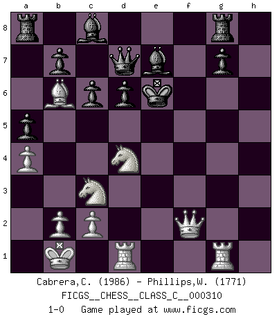 Last move : 1-0 2023 April 10 0:48:41 [Event "FICGS__CHESS__CLASS_C__000310"] [Site "FICGS"] [Date "2023.04.08"] [Round "1"] [White "Cabrera,Claudio"] [Black "Phillips,Wendell"] [Result "1-0"] [WhiteElo "1986"] [BlackElo "1771"] 1.e4 d6 2.d4 c6 3.Nc3 Qc7 4.f4 e5 5.Nf3 Nd7 6.g4 h6 7.a4 a5 8.Be3 Ngf6 9.Rg1 Be7 10.Qe2 Nh7 11.h4 exd4 12.Bxd4 Rg8 13.O-O-O Ndf6 14.g5 hxg5 15.hxg5 Nd7 16.Kb1 Nhf8 17.Qf2 Ng6 18.Bc4 Ndf8 19.Bb6 Qd7 20.f5 Nh8 21.g6 Bf6 22.e5 Be7 23.gxf7+ Nxf7 24.Bxf7+ Kxf7 25.e6+ Nxe6 26.fxe6+ Kxe6 27.Nd4+ 1-0 Follow this game move after move (download)Chess is above all, a fight ! (Emanuel Lasker) Ein Kibitz ist einer, der deinem Gegner gute Ratschläge gibt. (Andrew Soltis) ¿Que sería del Ajedrez sin errores graciosos?. (Kurt Richter) Ce qui caractérise les parties de combat, c'est que si le défenseur a constamment de difficiles problèmes à résoudre, l'attaquant doit chercher sans relâche de nouvelles possibilités d'attaque. (Koblentz) There are more things in heaven and earth than practically anywhere else. (Unknown)