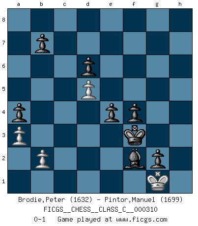 Last move : 0-1 2023 November 3 9:34:24 [Event "FICGS__CHESS__CLASS_C__000310"] [Site "FICGS"] [Date "2023.04.08"] [Round "1"] [White "Brodie,Peter"] [Black "Pintor,Manuel"] [Result "0-1"] [WhiteElo "1632"] [BlackElo "1699"] 1.Nf3 Nc6 2.Nc3 e5 3.e4 Bc5 4.d3 Nf6 5.Bg5 h6 6.Bh4 d6 7.Bxf6 Qxf6 8.Be2 Be6 9.O-O O-O 10.Qd2 Nd4 11.Nxd4 Bxd4 12.Nd1 Qg6 13.c3 Bb6 14.Ne3 a5 15.Bf3 c6 16.h3 Bxh3 17.Kh1 Be6 18.Rg1 Qf6 19.Rge1 Qh4+ 20.Kg1 Qg5 21.g4 h5 22.Qe2 g6 23.Nf5 gxf5 24.exf5 Bxf5 25.d4 hxg4 26.Be4 Bxe4 27.Qxe4 f5 28.Qd3 e4 29.Qe3 Qh5 30.Qg3 Rf6 31.Kg2 Kg7 32.Rh1 Qg5 33.Qh4 Qxh4 34.Rxh4 Rh8 35.Rxh8 Kxh8 36.Rh1+ Kg7 37.Kg3 a4 38.a3 Rh6 39.Rxh6 Kxh6 40.Kf4 Kg6 41.Ke3 Kg5 42.c4 Ba5 43.d5 cxd5 44.cxd5 Bb6+ 45.Ke2 Kf4 46.Ke1 Kf3 47.Kf1 f4 48.Kg1 g3 49.Kf1 g2+ 50.Kg1 Bxf2+ 0-1 Follow this game move after move (download)When you play Bobby, it is not a question if you win or lose. It is a question if you survive. (Boris Spassky) Wenn Capablanka heute auf der Schachbühne erscheinen würde, hätte er ein halbes Jahr gebraucht um sich die Schachtheorie anzueignen. Und dann hätte er alles und jeden besiegt. (Mikhail Moiseyevich Botvinik) El Ajedrez es sobre todo, ¡una pelea!. (Emanuel Lasker) Le système Elo représente seulement une moyenne. Il est simplement un indicateur de votre stabilité. (Anatoli Karpov) Perhaps chess is the wrong game for the times (The Chess Master and the Computer, by Garry Kasparov - 2010)