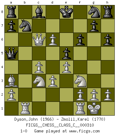 Last move : 1-0 2023 April 16 13:28:5 [Event "FICGS__CHESS__CLASS_C__000310"] [Site "FICGS"] [Date "2023.04.08"] [Round "1"] [White "Dyson,John"] [Black "Zmolil,Karel"] [Result "1-0"] [WhiteElo "1966"] [BlackElo "1770"] 1.e4 e5 2.Nf3 Nc6 3.Bc4 Bc5 4.d3 d6 5.O-O h6 6.c3 Na5 7.Bb5+ c6 8.Ba4 b5 9.b4 bxa4 10.bxc5 Ba6 11.c4 f6 12.cxd6 Qb6 13.Nc3 Bc8 14.Rb1 Qc5 15.Qxa4 Nb7 16.Ba3 Qa5 17.Qxc6+ 1-0 Follow this game move after move (download)No other master has such a terrific will to win. At the board he radiates danger, and even the strongest opponents tend to freeze, like rabbits when they smell a panther. Even his weaknesses are dangerous. As white, his opening game is predictable - you can make plans against it - but so strong that your plans almost never work. In the middle game his precision and invention are fabulous, and in the end game you simply cannot beat him. (Anonymous German Expert) Sitze auf Deine Hände. (Siegbert Tarrasch) Cuando tengo las piezas blancas, yo gano porque soy blanco; Cuando tengo las piezas negras, yo gano porque soy Bogolyubov. (Bogolyubov) Le succès, c'est être capable d'aller d'échec en échec sans perdre son enthousiasme. (Winston Churchill) Difficult things take a long time, impossible things a little longer. (Author unknown)