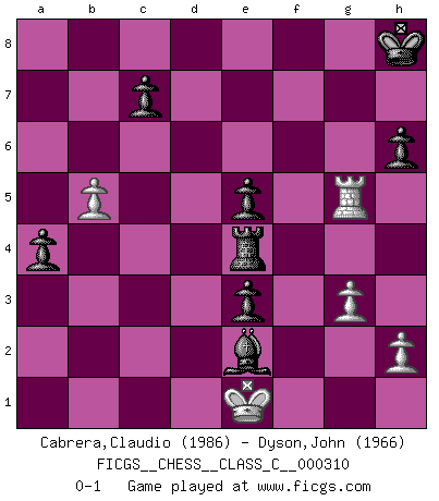 Last move : 0-1 2023 May 16 0:16:25 [Event "FICGS__CHESS__CLASS_C__000310"] [Site "FICGS"] [Date "2023.04.08"] [Round "1"] [White "Cabrera,Claudio"] [Black "Dyson,John"] [Result "0-1"] [WhiteElo "1986"] [BlackElo "1966"] 1.c4 e5 2.Nc3 Nf6 3.Nf3 Nc6 4.d4 exd4 5.Nxd4 Bb4 6.Bg5 h6 7.Bh4 d6 8.f3 O-O 9.e4 Re8 10.Be2 Nxd4 11.Qxd4 Bxc3+ 12.bxc3 Bd7 13.a4 a5 14.O-O Bc6 15.Bd1 Qe7 16.Bc2 b6 17.Rae1 Qe6 18.Qd3 Kf8 19.Bf2 Rad8 20.Bd4 Bb7 21.Qd1 Ba6 22.f4 Bxc4 23.Rf3 Nd7 24.Rg3 f6 25.Rf3 Kg8 26.Rh3 Re7 27.R1e3 Qf7 28.Reg3 Kh8 29.Be3 f5 30.Rh5 fxe4 31.f5 Nf6 32.Rh4 Qd5 33.Qxd5 Bxd5 34.Bd4 Rf8 35.Rg6 Kh7 36.g3 b5 37.axb5 a4 38.c4 e3 39.Bd1 Bg8 40.Kf1 Bxc4+ 41.Be2 Ne4 42.Rxe4 Rxe4 43.Rxg7+ Kh8 44.Bc3 Rxf5+ 45.Ke1 Bxe2 46.Rg5 Rfe5 47.Bxe5+ dxe5 0-1 Follow this game move after move (download)We like to think. (Gary Kasparov) Ich tröste mich mit dem Vergnügen, daß Schachfans, Zuschauer und Leser glücklich sind, wenn ein Großmeister etwas riskiert, statt nur Klötzchen zu schieben. (Mikhail Nekhemyevich Tal) El Ajedrez es tortura mental. (Garry Kasparov) Des combinaisons [dans le jeu d'échecs] pareilles à des mélodies. Je crois entendre pour ainsi dire la musique des coups... (Vladimir Nabokov) The arrogant army will lose certainly the battle. (Chinese proverb)
