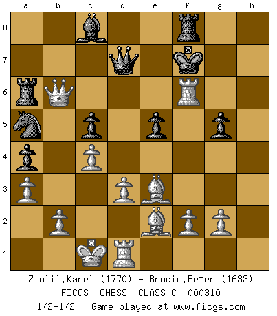 Last move : 1/2-1/2 2023 May 16 12:41:27 [Event "FICGS__CHESS__CLASS_C__000310"] [Site "FICGS"] [Date "2023.04.08"] [Round "1"] [White "Zmolil,Karel"] [Black "Brodie,Peter"] [Result "1/2-1/2"] [WhiteElo "1770"] [BlackElo "1632"] 1.e4 e5 2.Nf3 Nc6 3.d3 d6 4.h3 Nf6 5.Be3 Be7 6.Nc3 O-O 7.Qd2 h6 8.O-O-O d5 9.exd5 Nxd5 10.Nxd5 Qxd5 11.c4 Qd7 12.Qc3 Bb4 13.Qb3 a5 14.a3 Bd6 15.Be2 b6 16.Nd2 a4 17.Qc3 Bb4 18.Qc2 Bxd2+ 19.Qxd2 g5 20.h4 f6 21.hxg5 fxg5 22.Rxh6 Na5 23.Qb4 c5 24.Qxb6 Ra6 25.Rg6+ Kf7 26.Rf6+ Kg7 27.Rg6+ Kf7 28.Rf6+ Kg7 29.Rg6+ Kf7 30.Rf6+ 1/2-1/2 Follow this game move after move (download)Chess mastery essentially consists of analyzing Chess positions accurately. (Mikhail Botvinnik) Ich habe die besten Aussichten, den ersten Preis zu gewinnen - denn jeder muss gegen Steinitz spielen, nur ich nicht! (Wilhelm Steinitz) Yo siempre he tenido un ligero sentimiento de lástima por una persona que no tiene conocimiento del Ajedrez. (Siegbert Tarrasch) J'apprécie les joueurs d'est-indienne, c'est grâce à eux que je nourris ma famille depuis tant d'années. (Petrosian) To be champion requires more than simply being a strong player; one has to be a strong human being as well. (Anatoly Karpov)