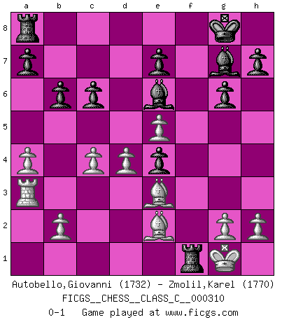 Last move : 0-1 2023 June 30 7:3:37 [Event "FICGS__CHESS__CLASS_C__000310"] [Site "FICGS"] [Date "2023.04.08"] [Round "1"] [White "Autobello,Giovanni"] [Black "Zmolil,Karel"] [Result "0-1"] [WhiteElo "1732"] [BlackElo "1770"] 1.c4 Nf6 2.Nc3 g6 3.d4 Bg7 4.e4 O-O 5.e5 Ne8 6.f4 c6 7.Nf3 f5 8.exf6 Nxf6 9.Be2 d5 10.O-O Ne4 11.Nxe4 dxe4 12.Ne5 Be6 13.Be3 Qd6 14.Qb3 b6 15.a4 Nd7 16.Qa3 Qxa3 17.Rxa3 Nxe5 18.fxe5 Rxf1+ 0-1 This chess game has been lost on time (started : 2023.04.08 4:19:17) Follow this game move after move (download)The beauty of a move lies not in its' appearance but in the thought behind it. (Siegbert Tarrasch) Um dein Spiel zu verbessern musst du zuallererst das Endspiel studieren, denn diese kann unabhängig studiert werden. Die Eröffnung und das Mittelspiel müssen immer in Bezug gesetzt werden zum Endspiel. (José Raúl Capablanca) El Ajedrez demanda una total concentración. (Bobby Fischer) Tout change constamment, y compris dans le monde des Echecs. (Botvinnik) Strategy without tactics is the slowest route to victory. Tactics without strategy is the noise before defeat. (Sun Tzu)