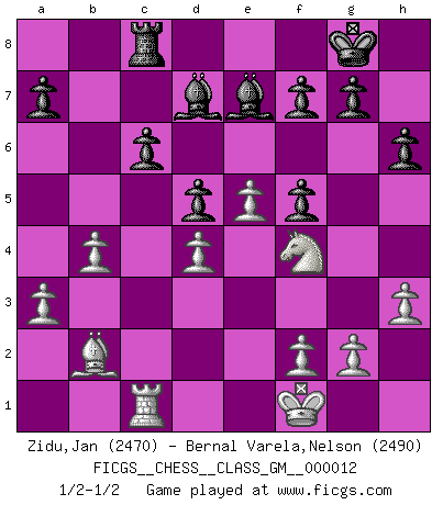 Last move : 1/2-1/2 2023 June 8 14:12:27 [Event "FICGS__CHESS__CLASS_GM__000012"] [Site "FICGS"] [Date "2023.04.08"] [Round "1"] [White "Zidu,Jan"] [Black "Bernal Varela,Nelson"] [Result "1/2-1/2"] [WhiteElo "2470"] [BlackElo "2490"] 1.e4 e6 2.d4 d5 3.e5 c5 4.c3 Qb6 5.Nf3 Nc6 6.a3 Nh6 7.Bd3 cxd4 8.O-O Bd7 9.b4 Rc8 10.Bb2 Nf5 11.Bxf5 exf5 12.cxd4 Na5 13.Nfd2 Be6 14.Nc3 Nc4 15.Nxc4 Rxc4 16.Qa4+ Rc6 17.Rac1 Be7 18.Ne2 h6 19.h3 O-O 20.Rxc6 Qxc6 21.Qxc6 bxc6 22.Rc1 Rc8 23.Nf4 Bd7 24.Kf1 1/2-1/2 Follow this game move after move (download)Tactics flow from a superior position. (Bobby Fischer) Schach ist gnadenlos. Du mußt bereit sein zu töten. (Nigel Short) Un Peón pasado aumenta su poder a medida de que el número de piezas en el tablero disminuye. (Capablanca) Même si l'adversaire joue le coup analysé précédemment, recommencez l'analyse en voyant la nouvelle position. Première règle de Blumenfeld Some people are so afraid to die that they never begin to live. (Henry Van Dyke)