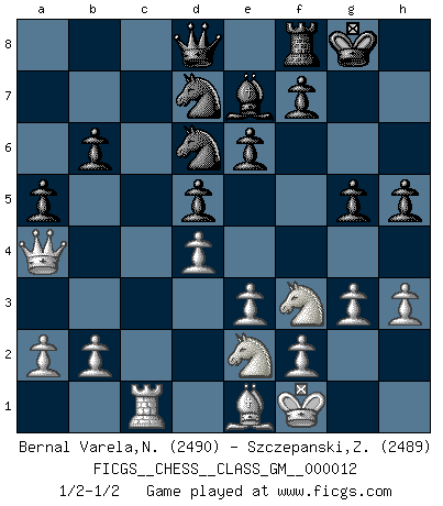 Last move : 1/2-1/2 2023 April 28 16:44:30 [Event "FICGS__CHESS__CLASS_GM__000012"] [Site "FICGS"] [Date "2023.04.08"] [Round "1"] [White "Bernal Varela,Nelson"] [Black "Szczepanski,Zbigniew"] [Result "1/2-1/2"] [WhiteElo "2490"] [BlackElo "2489"] 1.Nf3 d5 2.d4 Nf6 3.c4 e6 4.g3 Bb4+ 5.Bd2 Be7 6.Bg2 O-O 7.O-O c6 8.Qc2 b6 9.Nc3 Nbd7 10.cxd5 cxd5 11.Qb3 Bb7 12.Rfc1 Rc8 13.Be1 Ne4 14.e3 h6 15.Qa4 a6 16.Ne2 a5 17.Rxc8 Bxc8 18.Rc1 Ba6 19.Bf1 g5 20.h3 h5 21.Nc3 Bxf1 22.Kxf1 Nd6 23.Ne2 Ne4 24.Nd2 Nd6 25.Nf3 Ne4 26.Nd2 Nd6 27.Nf3 1/2-1/2 Follow this game move after move (download)By this measure (on the gap between Fischer & his contemporaries), I consider him the greatest world champion. (Garry Kasparov) Wir können eben der zündenden Macht des Opfers nicht wiederstehen, denn die Begeisterung für das Opfer liegt in der Natur des Menschen. (Rudolf Spielmann) La batalla por la última verdad nunca sera ganada. Y es por eso que el Ajedrez es tan fascinante. (Hans Kmoch) Je crois qu'il existe des manières très spécifiques de jouer efficacement contre une machine. Evidemment, nous n'avons aucune chance en technique pure, parce que l'ordinateur calcule de manière parfaite. Mais lorsque nous faisons appel à notre cerveau, en utilisant l'intuition et la compréhension, alors nous restons beaucoup plus forts. (Anatoli Karpov) Pushing plastic is for the many, pushing virtual pieces is for the fewer, pushing wood is for the very few. (Normajean Yates)