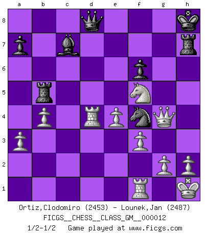 Last move : 1/2-1/2 2023 May 9 13:13:10 [Event "FICGS__CHESS__CLASS_GM__000012"] [Site "FICGS"] [Date "2023.04.08"] [Round "1"] [White "Ortiz,Clodomiro"] [Black "Lounek,Jan"] [Result "1/2-1/2"] [WhiteElo "2453"] [BlackElo "2487"] 1.d4 Nf6 2.c4 e6 3.Nc3 Bb4 4.f3 c5 5.d5 b5 6.e4 d6 7.a3 Ba5 8.Bd3 bxc4 9.Bxc4 O-O 10.Nge2 Ba6 11.Bxa6 Nxa6 12.O-O exd5 13.Nxd5 Nxd5 14.Qxd5 Nc7 15.Qh5 d5 16.Ng3 c4 17.Kh1 Rb8 18.Qg4 d4 19.Bg5 f6 20.Bh6 Rf7 21.Rac1 Kf8 22.Qf5 Rb5 23.Qxh7 gxh6 24.Qxh6+ Kg8 25.Nf5 Rh7 26.Qg6+ Kh8 27.Rxc4 Ne6 28.b4 Nf4 29.Qg4 Bc7 30.Rxd4 1/2-1/2 Follow this game move after move (download)One doesn't have to play well, it's enough to play better than your opponent. (Siegbert Tarrasch) Kostenjuk hat keinen Sexappeal. (Loek van Wely) El Ajedrez es realmente noventa y nueve por ciento calculación. (Soltis) La conception d'un plan est le processus par lequel un joueur exploite les avantages de sa position tout en s'efforçant d'en réduire au minimum les inconvénients. Afin de garantir le succès, un plan doit toujours se fonder sur un diagnostic objectif des particularités d'une position. La conception d'un plan est d'autant plus difficile que la position est équilibrée, et grandement facilitée lorsqu'il n'existe qu'un seul plan susceptible de répondre aux exigences de la position. (Harry Golombek) There is a computer disease that anybody who works with computers knows about. It's a very serious disease and it interferes completely with the work. The trouble with computers is that you 'play' with them ! (Richard P. Feynman)