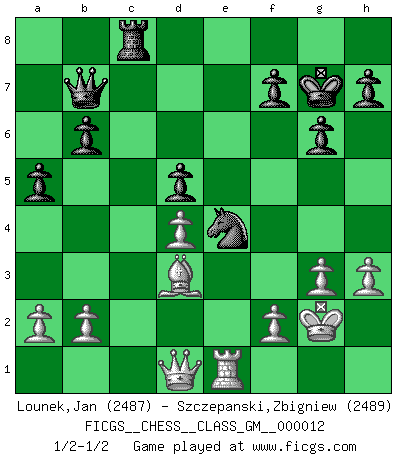 Last move : 1/2-1/2 2023 April 24 14:1:6 [Event "FICGS__CHESS__CLASS_GM__000012"] [Site "FICGS"] [Date "2023.04.08"] [Round "1"] [White "Lounek,Jan"] [Black "Szczepanski,Zbigniew"] [Result "1/2-1/2"] [WhiteElo "2487"] [BlackElo "2489"] 1.e4 e5 2.Nf3 Nc6 3.Bb5 Nf6 4.O-O Nxe4 5.Re1 Nd6 6.Nxe5 Nxe5 7.Rxe5+ Be7 8.Bf1 O-O 9.d4 Ne8 10.c4 Bf6 11.Re1 d5 12.cxd5 Qxd5 13.Be3 Be6 14.Nc3 Qd7 15.h3 c6 16.Ne4 Bd5 17.Nc5 Qc7 18.Qg4 b6 19.Na6 Qb7 20.Rac1 Nc7 21.Bd3 g6 22.Qd7 Rac8 23.Nb4 Rfd8 24.Nxd5 cxd5 25.Qa4 Ne6 26.Rxc8 Rxc8 27.g3 Kg7 28.Bb5 Bg5 29.Bxg5 Nxg5 30.Kg2 a5 31.Qd1 Ne4 32.Bd3 1/2-1/2 Follow this game move after move (download)Chess is a terrible game. If you have no center, your opponent has a freer position. If you do have a center, then you really have something to worry about ! (Siegbert Tarrasch) Wie ich sie so einen nach dem anderen nieder mähte wurde meine Überlegenheit offensichtlich. (José Raúl Capablanca) El Ajedrez es una hermosa aventura. (Bent Larsen) Des points faibles ou des trous dans la position de l'adversaire doivent être occupés par des pièces et non pas par des pions. (Siegbert Tarrasch) Vladimir Ras-Putin is still alive... He is also a good actor, I saw him in the Lord of the Rings. (Rodolfo d'Ettorre)
